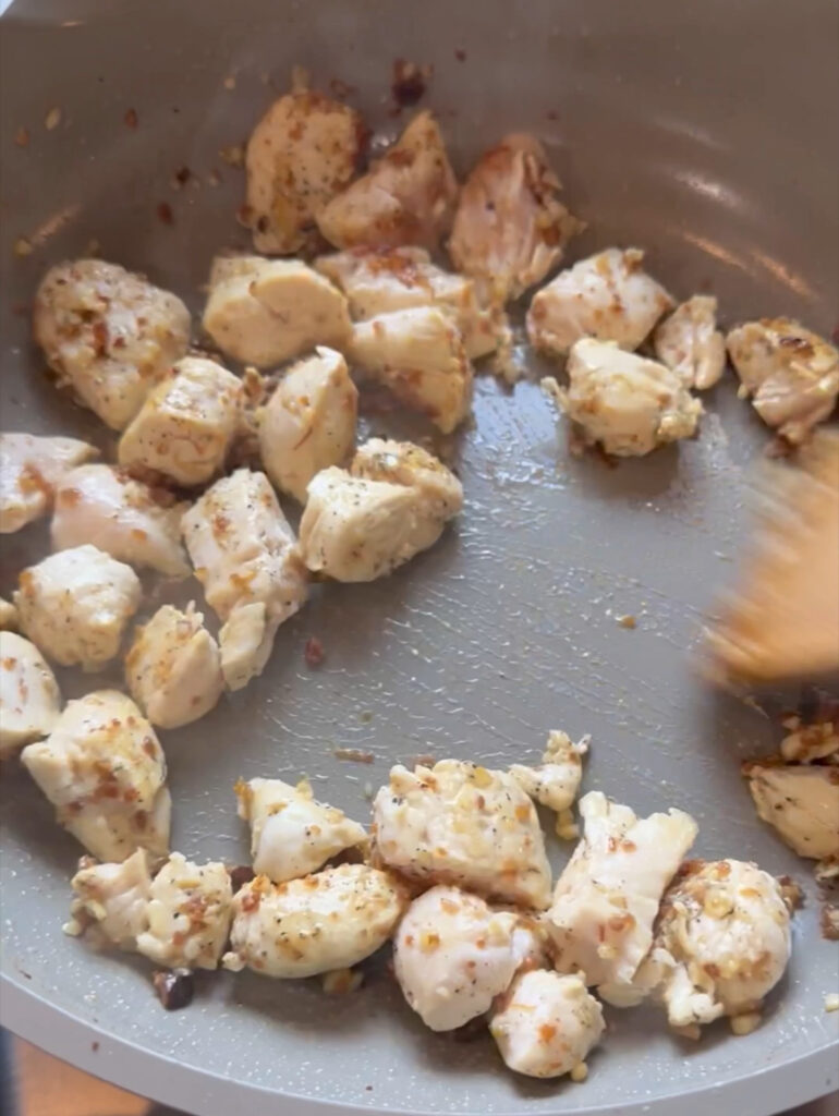- Add chopped up bacon to the skillet and cook with chicken. I didn't have bacon on hand, so I used real bacon bits and they worked just fine. You could also cook up a few slices on a microwave bacon tray and crumble and add to chicken if you prefer.