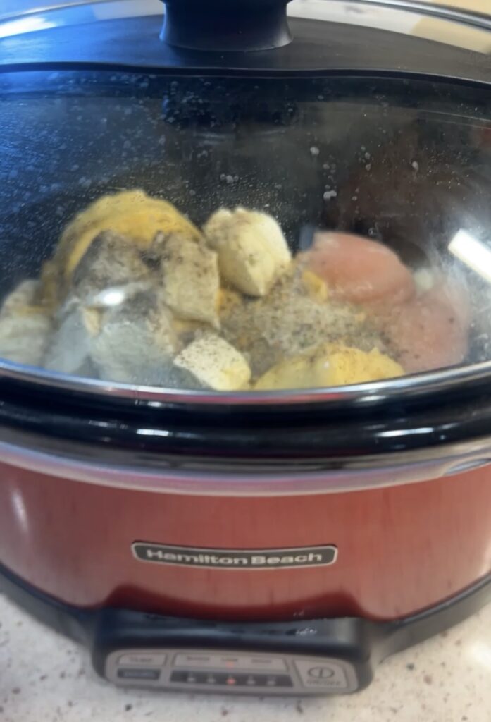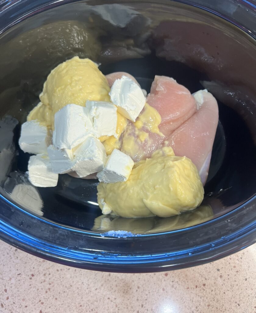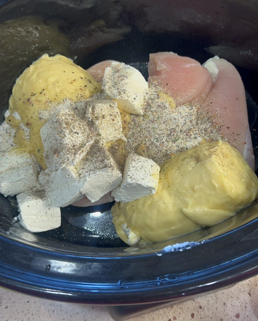 - add 3-4 chicken breasts in the bottom of a slow cooker
