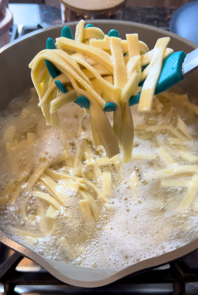 - once chicken is done , you will you want to grab a large pot fill with water and bring it to a boil an pour in 16 oz of egg noodles. Any egg noodles will do but I prefer the Amish Egg noodles they just taste so homemade.