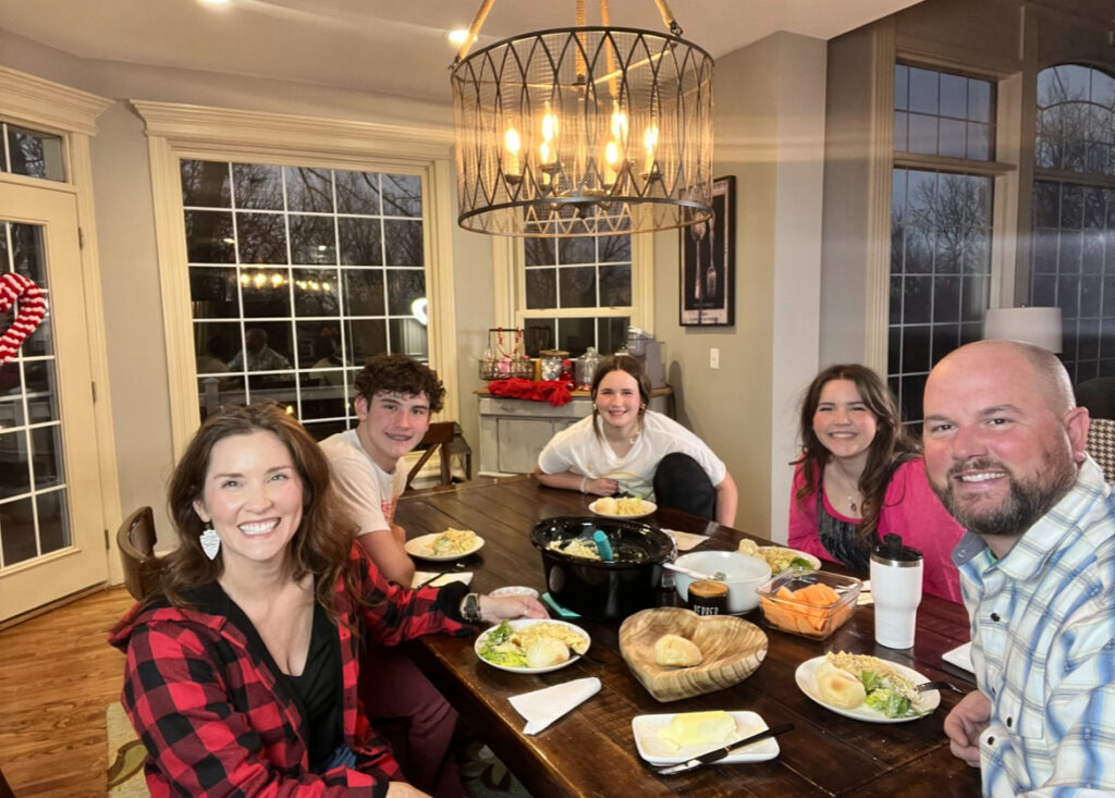 These smiles right here say it all! Your kitchen is the heart of your home mama and my table is the foundation for intentional time together. Our meals don’t have to be fancy to feed the body, heart and soul and give back what we crave the most as a family “togetherness”. After all, time is fleeting and sooner rather than later my kids will fly the nest. In fact, as you can see in the photo an empty chair, one is already off to college and we miss him terribly! We don’t get back opportunities to spend time together, so we take every opportunity we can to sit down together to have a meal. This is our moment to regroup and connect and I prioritize this each day at dinner, because one thing that is for certain no matter the age kids are always hungry! So call me an opportunist if you will, this is just a reminder to make intentional living part of your daily routine. I promise you will not regret it!