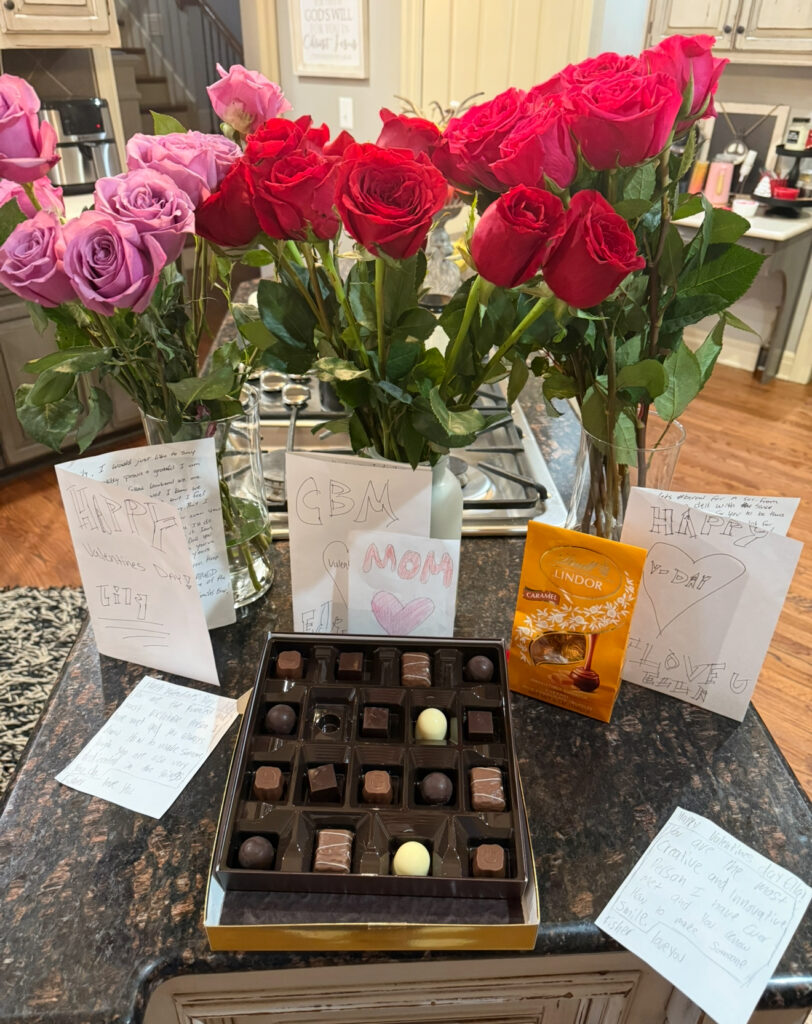 Until then, this is the first Valentine's Day without their dad and I without the love of my life. So my boys worked hard to take over the role of their father and surprised us with hand written cards with the most heart felt words, chocolates and flowers. When I woke up to see it laying out for us in the kitchen this morning it couldn't have been more perfect. Not only did they think of me, they thought of their sweet sisters. This made my heart not only explode with pride but equally I was overwhelmed with sadness and so much gratitude!
