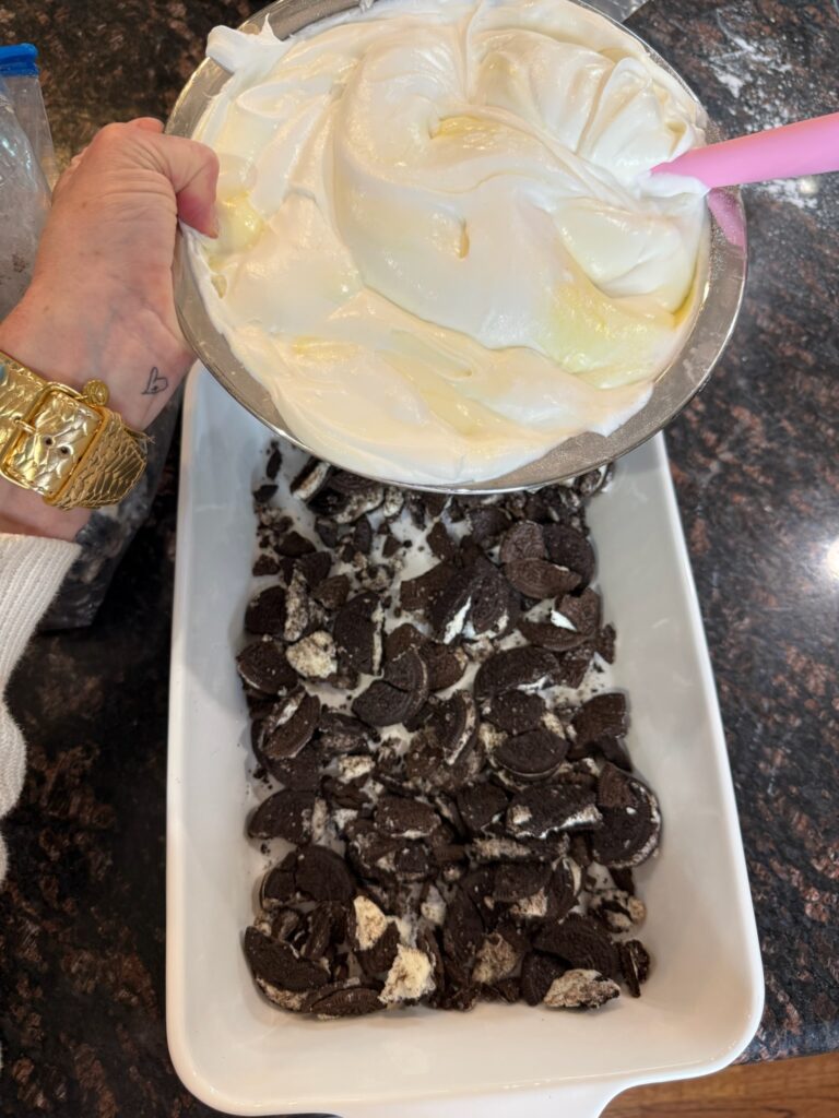 - In a large bowl or aluminum pan add Oreo to the bottom.