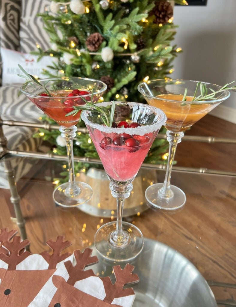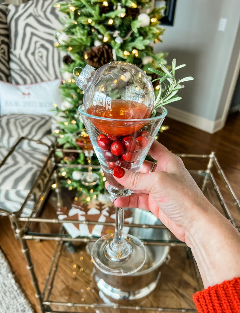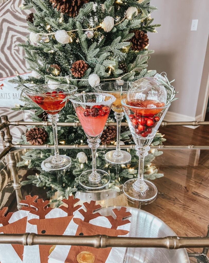Whether you make a cocktail or mocktail don’t forget the garnishes for each that’s what makes them so fun. Rosemary, fresh fruits like cranberry, festive straws, rimming glass in sugar and of course edible glitter. Love this set that I have HERE