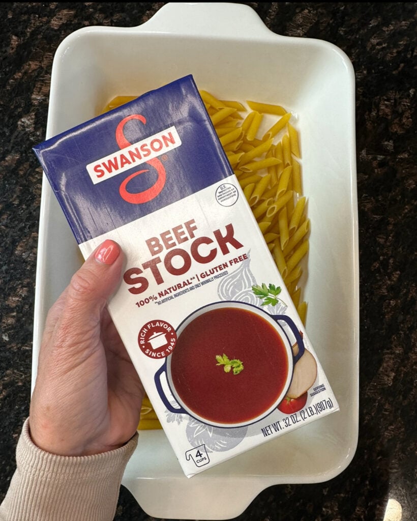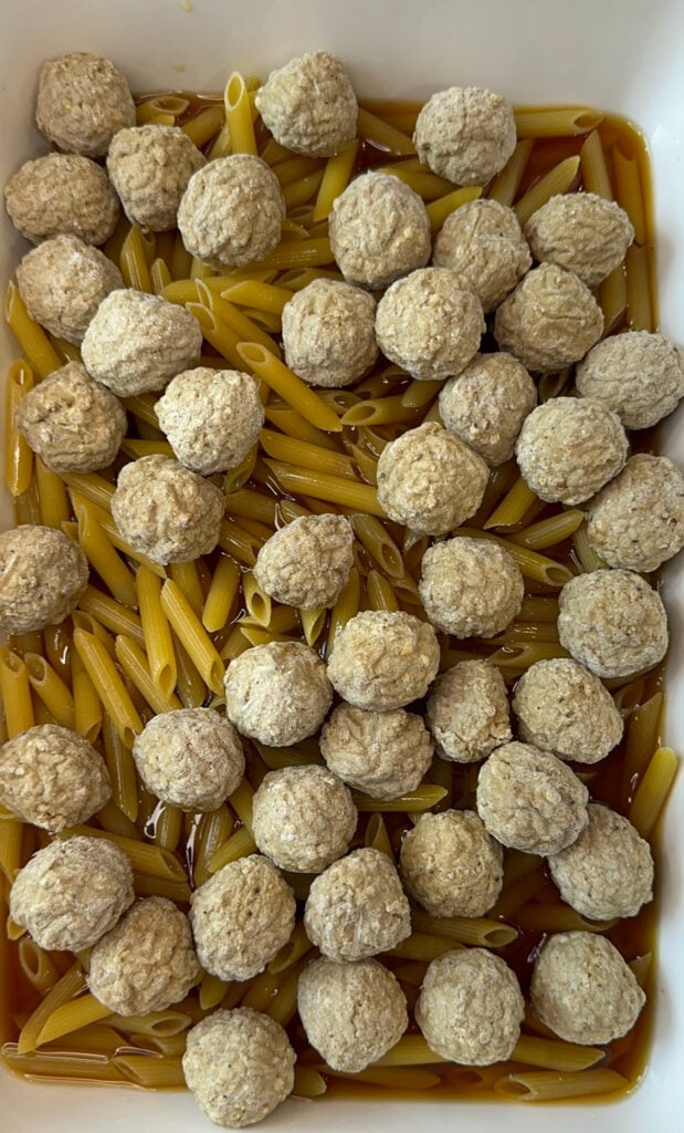 It took WAY longer to cook in my oven to heat frozen meatballs through AND to have pasta cooked al dente. Beef stock flavor was too strong – might cook half stock, half water if I try it again.