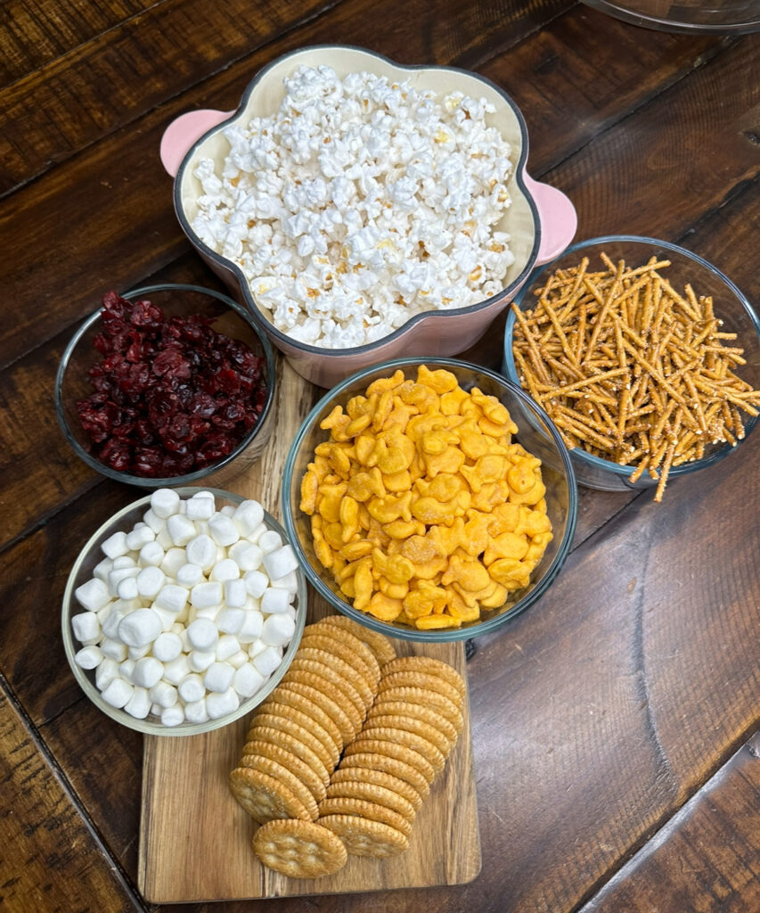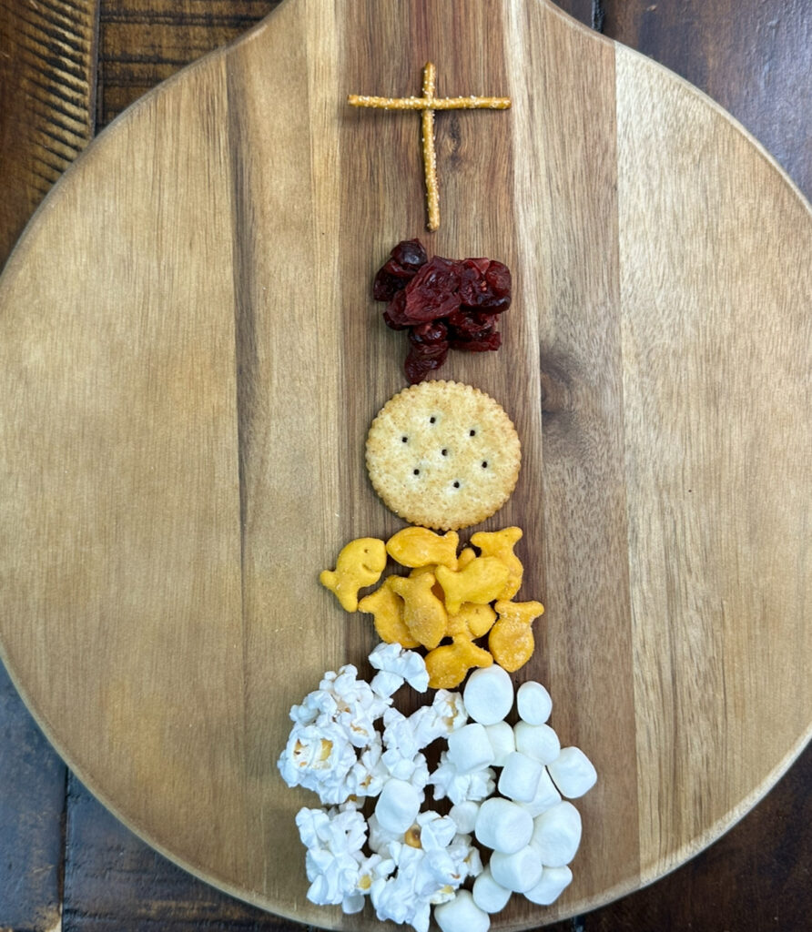 If you are doing this fun resurrection snack mix with your kiddos, I love to lay out ingredients like this and explain each piece as we put the snack mix together.
