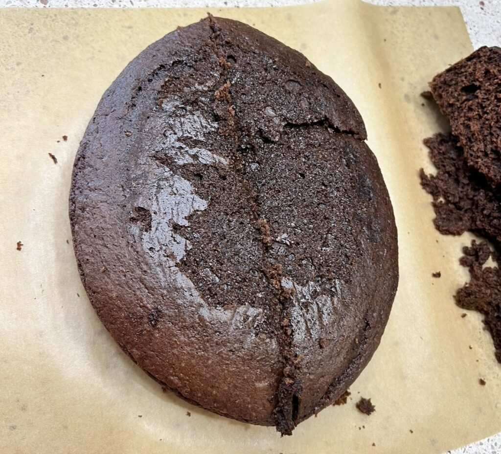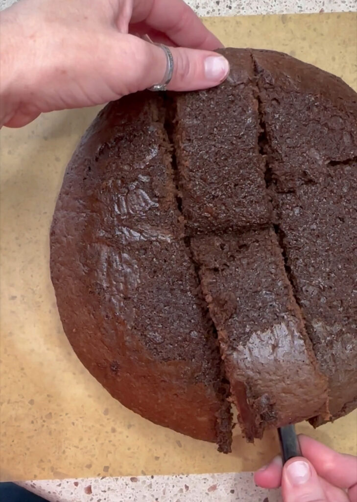 Once your cake has baked fully and cooling remove from pan and place on a parchment sheet for easy clean up. Slice down the middle about a 2-3 inch section then remove. You can use this for cake pops in the future so hang on to it if you want!