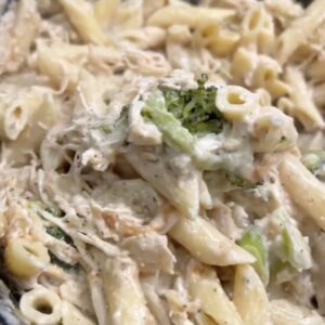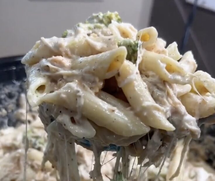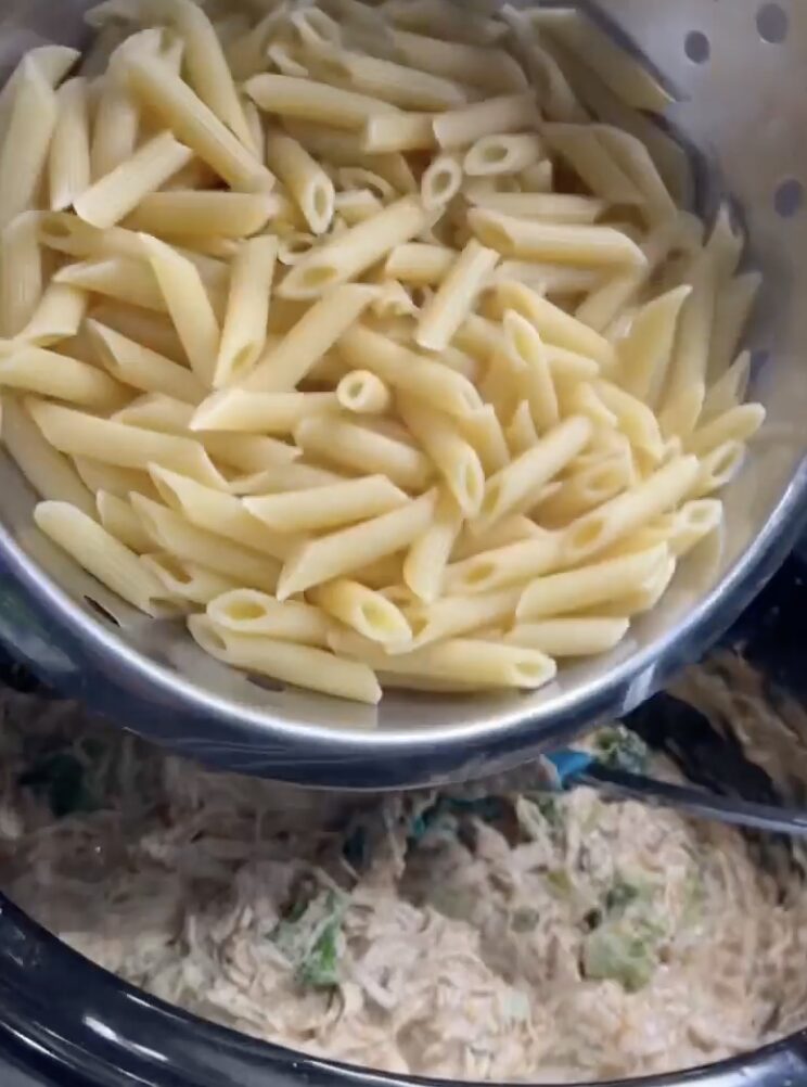 3. Shred chicken then add a bag of cooked broccoli, shredded parmesan, heavy whipping cream, and cooked pasta.