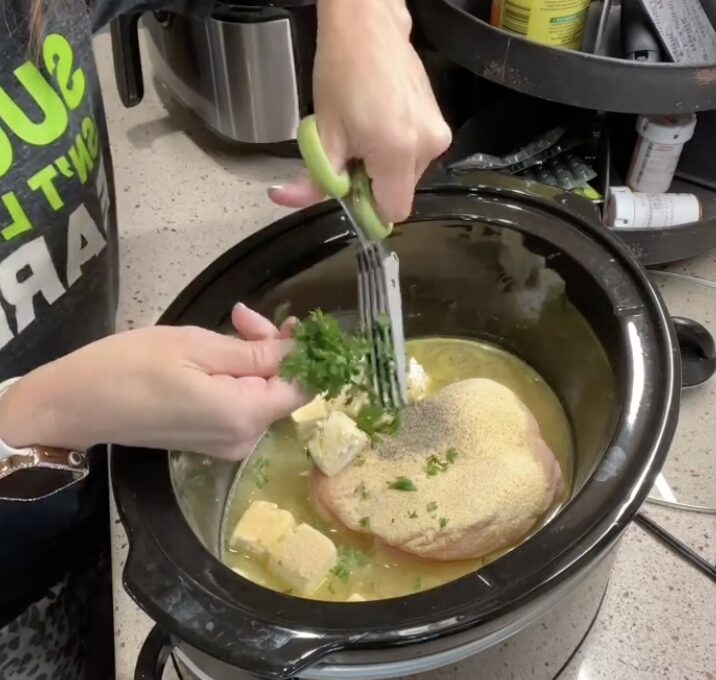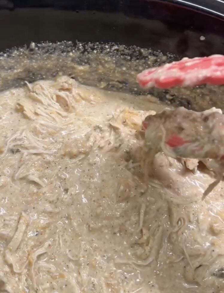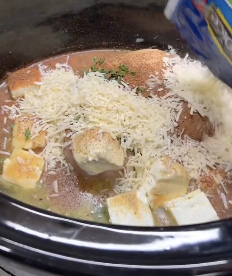• In slow Cooker combine 2 lbs chicken breasts, 2 cups chicken broth, 1 block cream cheese, 2 cups shredded mozzarella cheese, 2 tbsp minced onion, parsley, 1 tbsp garlic, 1 tbsp nutmeg, and salt & pepper