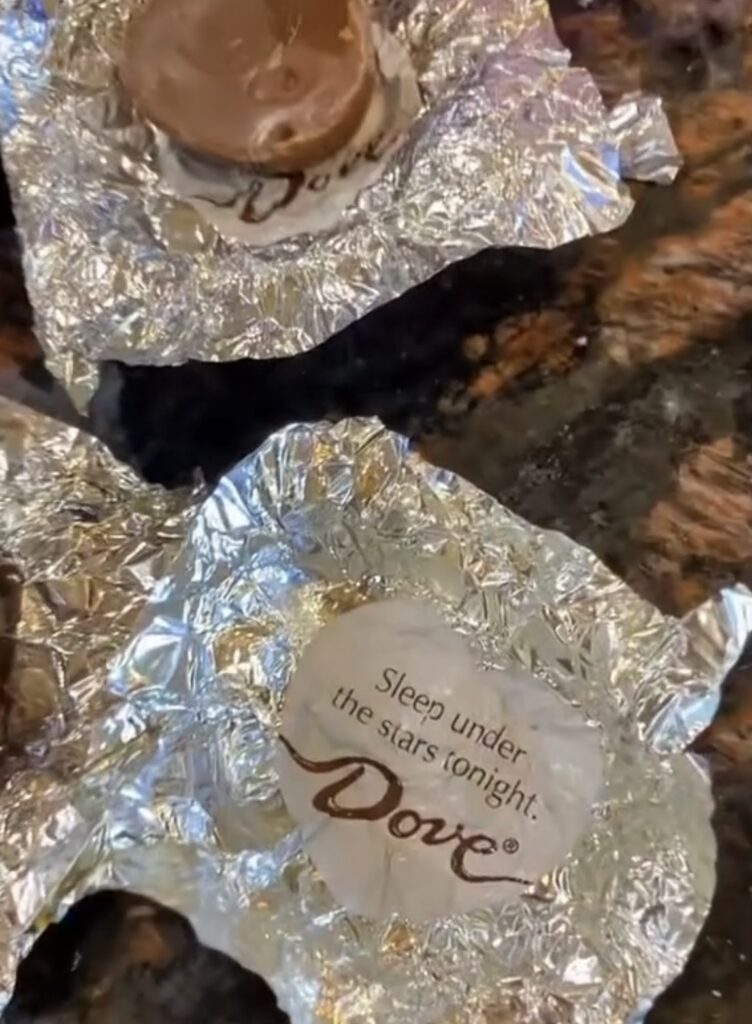 • While cookie is still hot place unwrapped dove chocolate on top of that cookie and press in a bit for it to melt a little, this will help it adhere when the cookie cools down