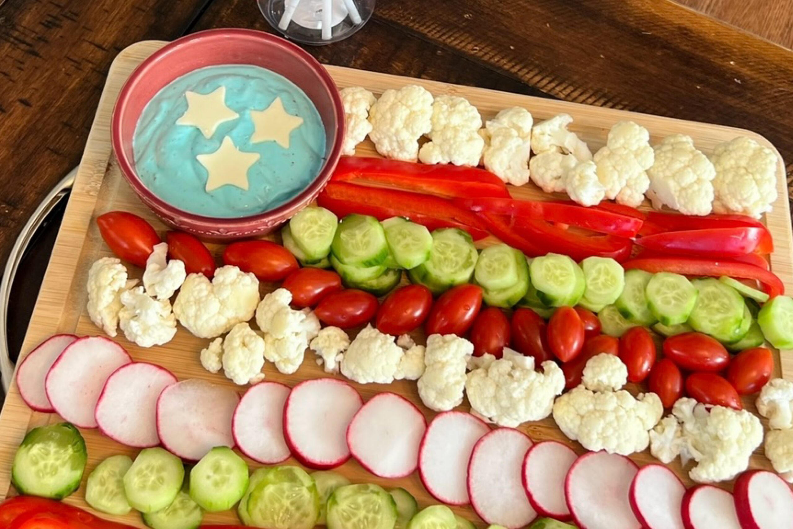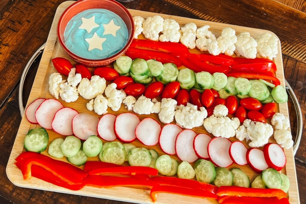 - Grab a serving tray with handles and arrange vegetables in horizontal lines with red veggies in between the white ones to mimic the stripes on the flag. Making sure to leave a space open for the dish in the upper left hand corner.