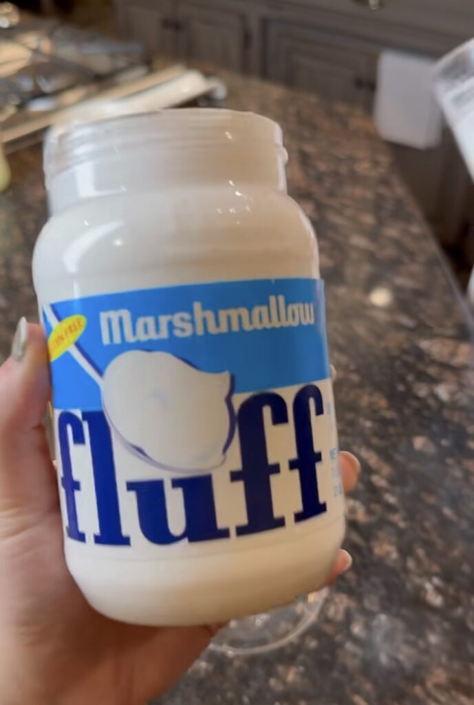 Take a cup, I love to use the clear to go cups for iced coffee and take a spatula with marshmallow fluff and cover the entire inside of the cup