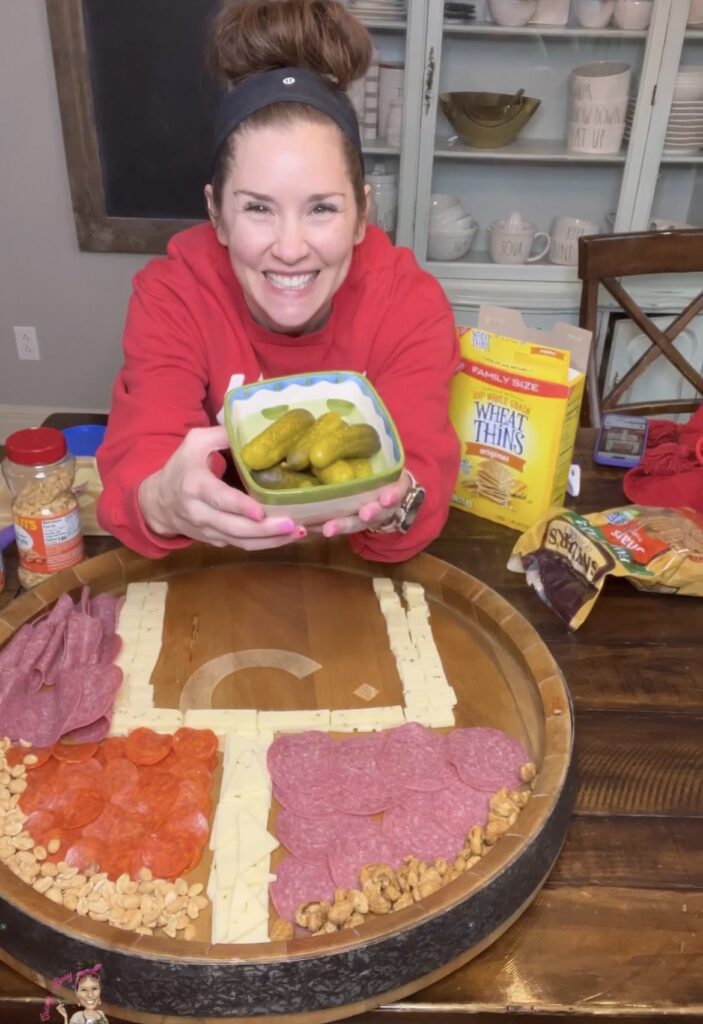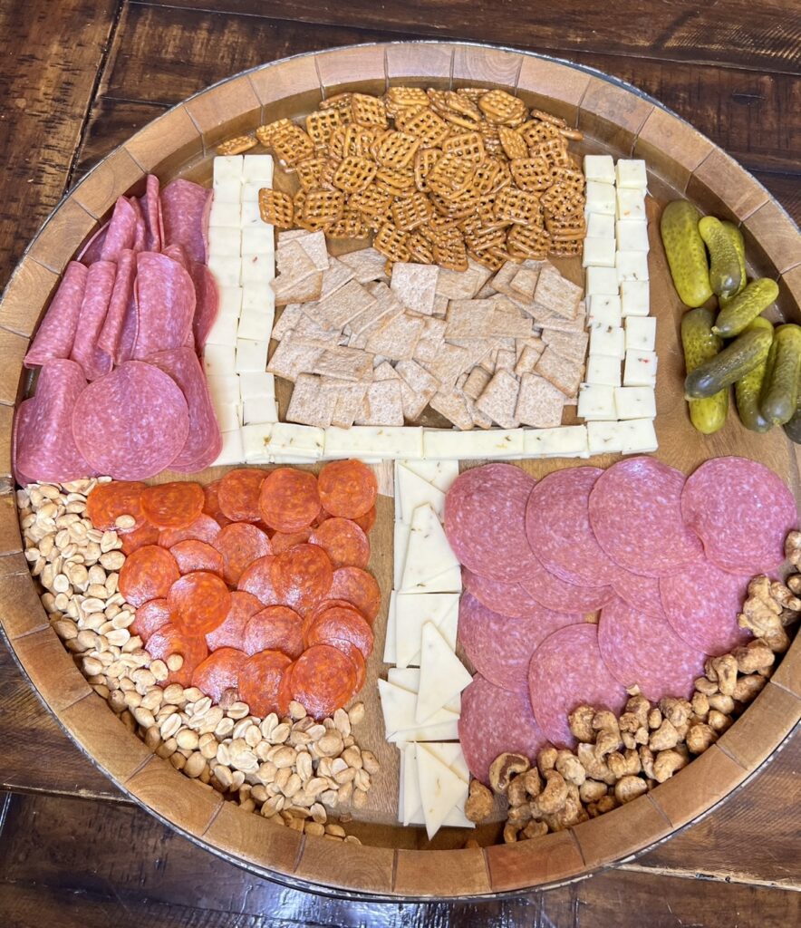 Love having a lazy susan style charcuterie board for this makes it super easy to serve this way. Also love the wine barrel lazy susan as it gives it s nice lip so nothing falls off. When you start building this Football Charcuterie Board start with the cheese goal post and work from there. This will help to build a foundation for the board allowing your to build out with favorite crackers, meats, pickles and nuts.