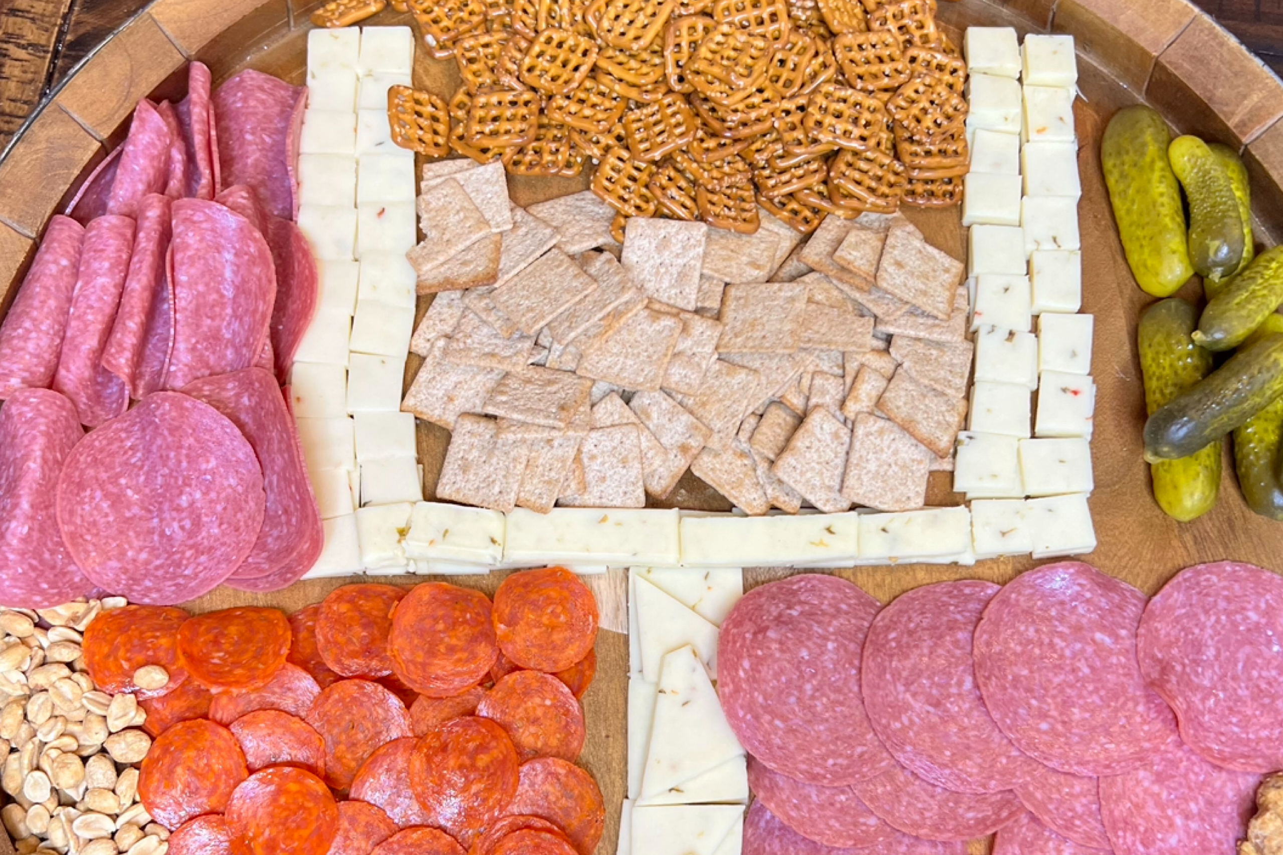 Love having a lazy susan style charcuterie board for this makes it super easy to serve this way. Also love the wine barrel lazy susan as it gives it s nice lip so nothing falls off. When you start building this Football Charcuterie Board start with the cheese goal post and work from there. This will help to build a foundation for the board allowing your to build out with favorite crackers, meats, pickles and nuts.