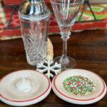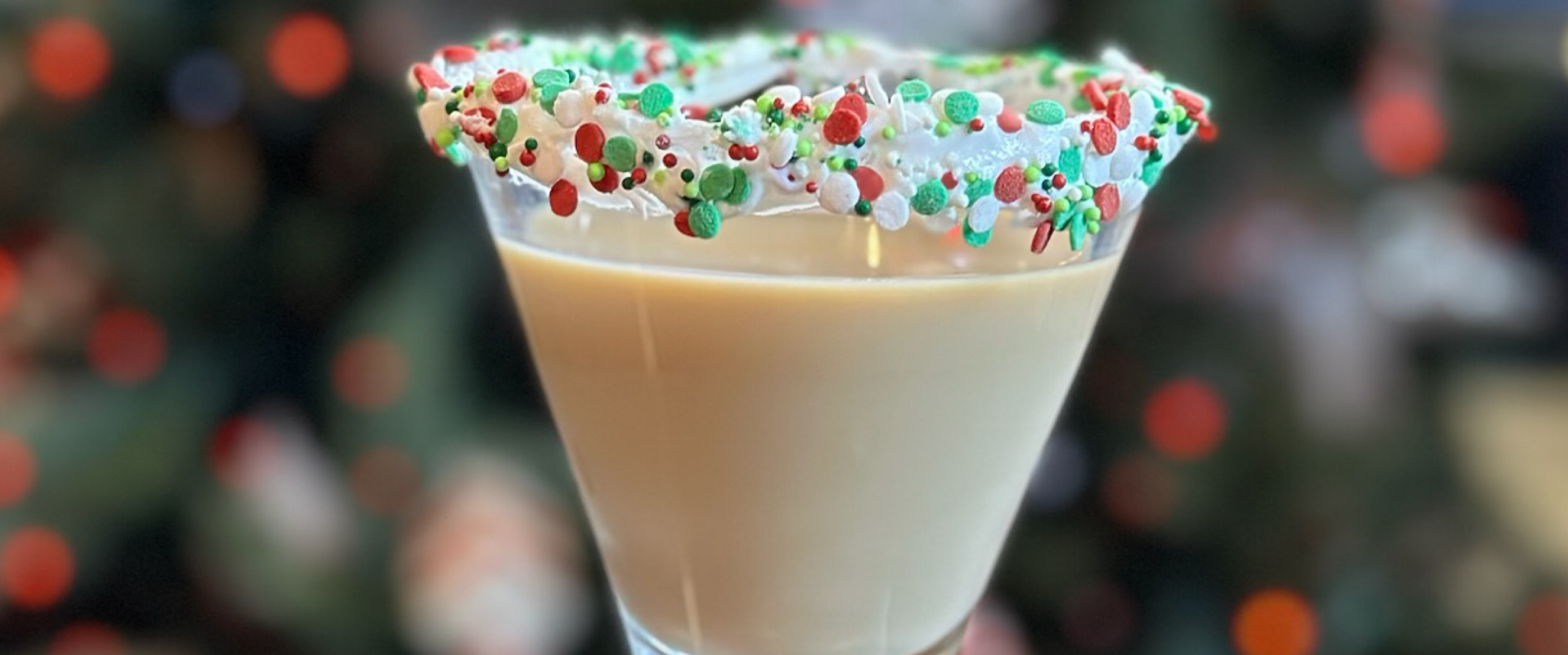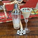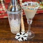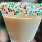 Using vanilla icing rim martini glasses until covered generously. Then roll around on second plate with sprinkles until you get that covered on all sides. I use the variety of Christmas sprinkles so I can get the different textures. Take shaker and pour in the glass and get ready to serve this deliciousness such a tasty and festive drink.