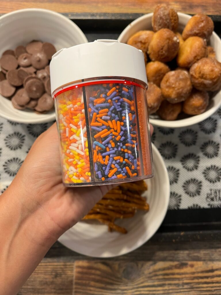 Not only does this save counter space, but it also makes your Halloween Donut Acorns look extra neat and professional.