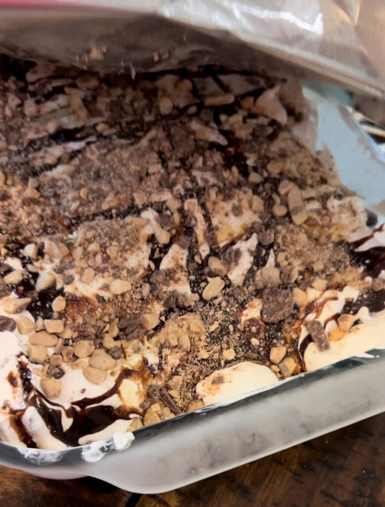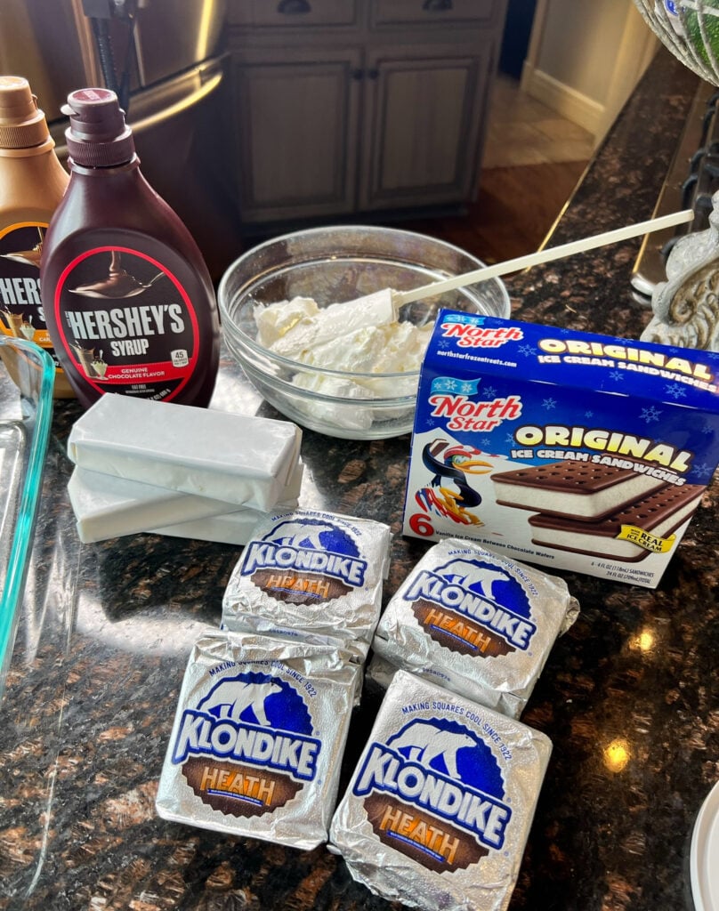 - In a 9X13 pan Line and layer with unwrapped ice cream sandwiches