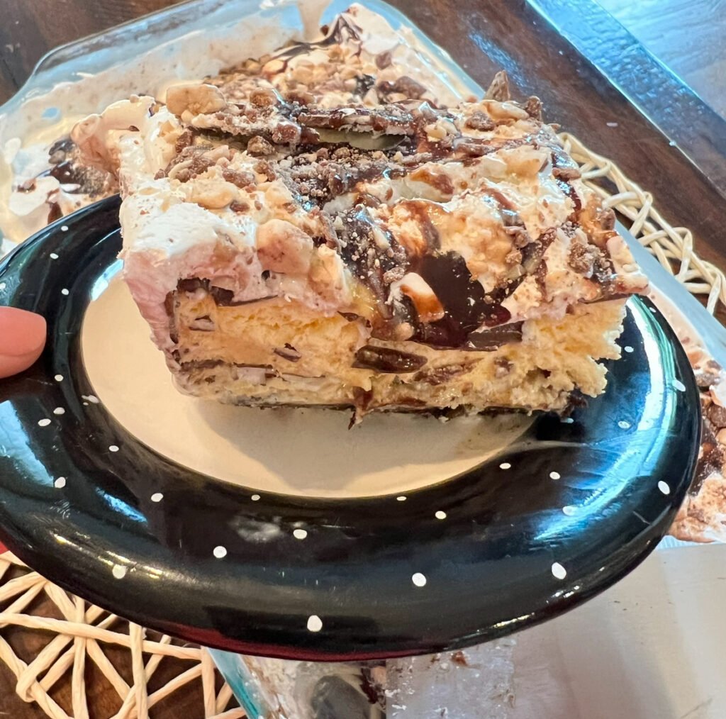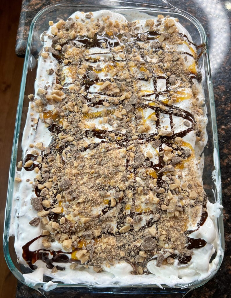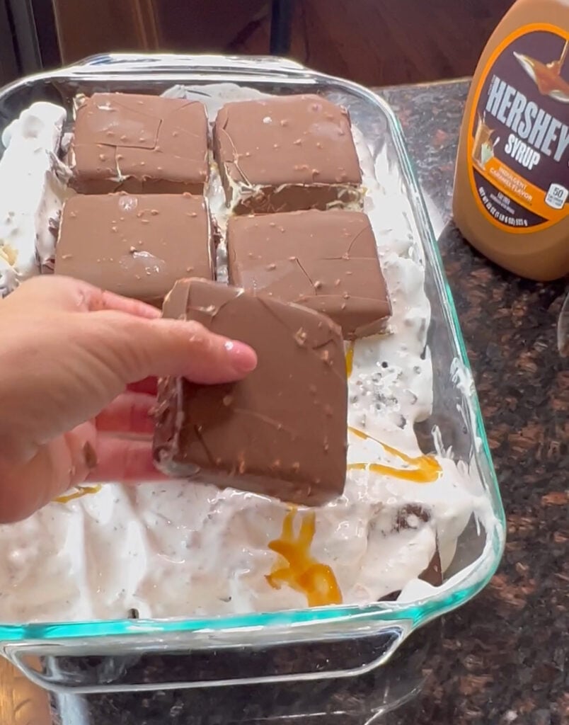 - Then add Heath Klondike bars to the top of the mixture. For a 9X13 you will need 8