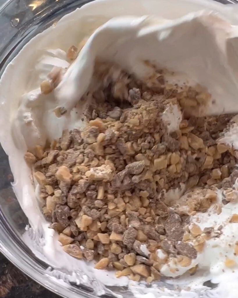 - In a medium bowl take cool whip and mix in heath bits and mix together well (leave about 1/2 cup of heath bits and set aside)