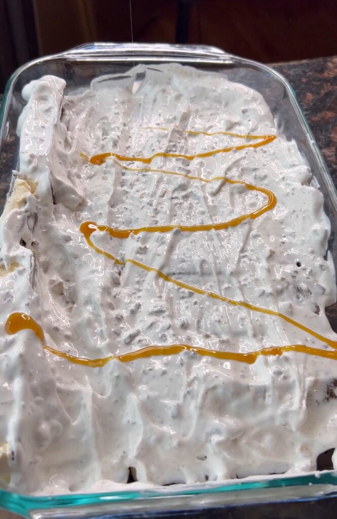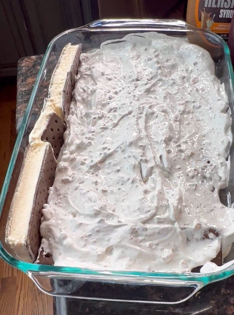 - Take half of cool whip mixture and cover the ice cream sandwiches , once covered drizzle with chocolate syrup and Carmel on top