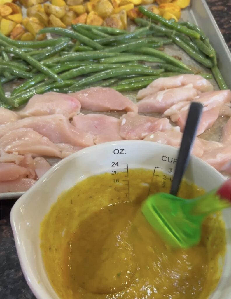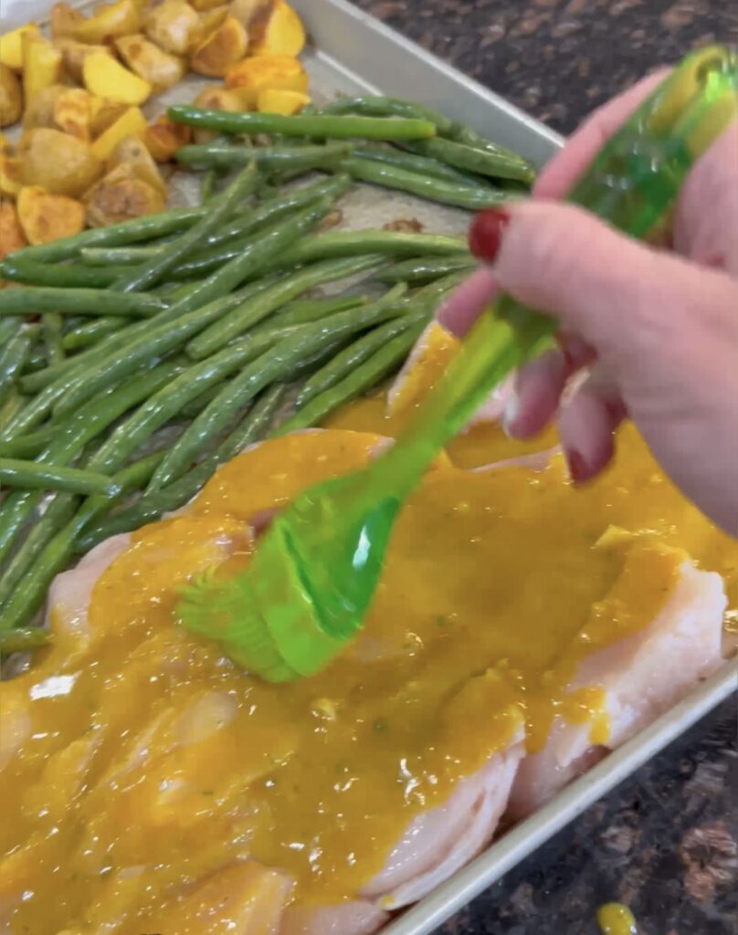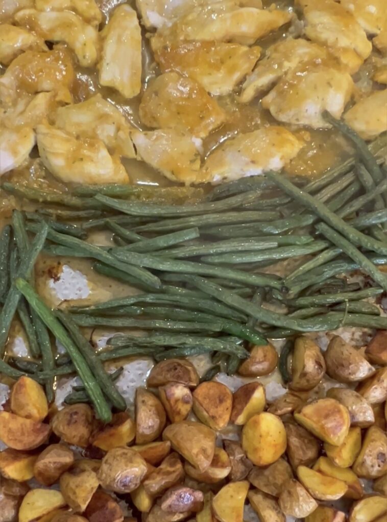 As you will see in the directions, this sheet pan is a two step process because the potatoes take a bit longer to cook than the chicken and green beans. And you will want to wait to put the honey mustard glaze on the chicken on step 2, after the potatoes are slightly cooked. I am obsessed with my honey mustard glaze its incredible! You can even make it as a dipping sauce for chicken nuggets like these Easy Airfryer Ranch Ritz Chicken Nuggests I do believe it is best when you use an organic, raw and unfiltered honey like Blue Hive Honey we use one of the plain honeys like clover or wildflower depending on what is in season. You can use code:LORI10 in your cart to save on entire purchase.