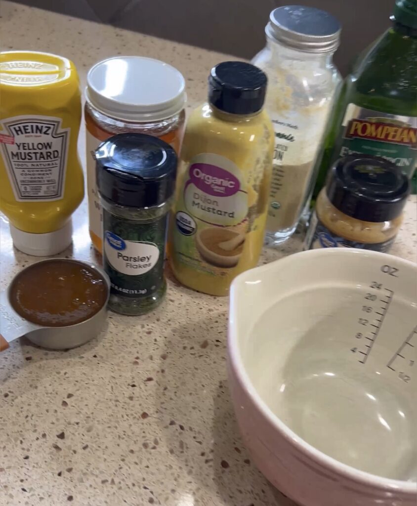 - in a bowl mix honey, both mustards, and seasonings together. Mix until combined and set aside.