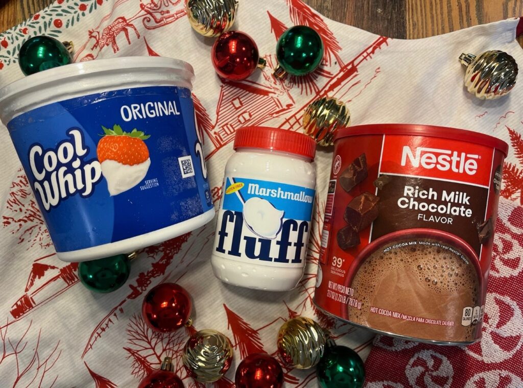 - In a large mixing bowl, add marshmallow fluff, Cool Whip, and hot cocoa mix.