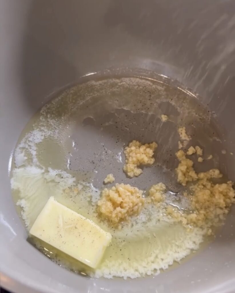 - in a pot over medium high heat add butter, garlic and onion- fresh, powder or minced