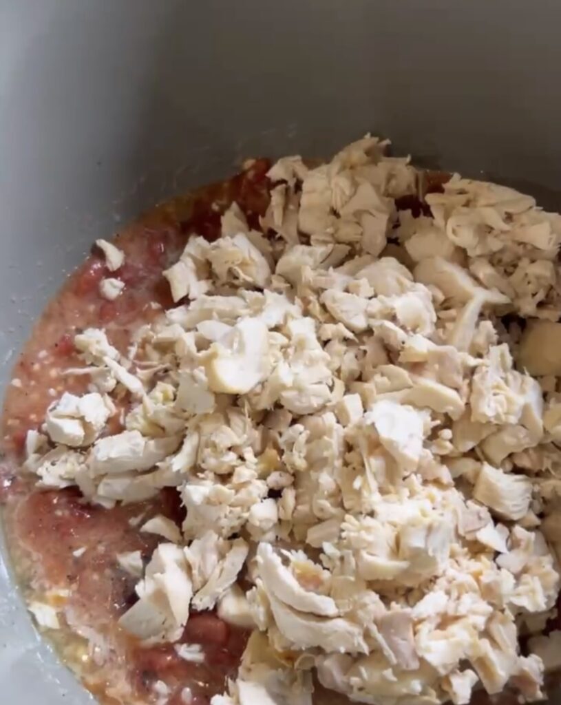 Add tomatoes, chopped rotisserie chicken, tomato paste and combine well. In the video tutorial I show using frozen tomato paste that I added when I added broth so it would combine better. If you have never saved and froze your left over tomato paste that you are not using in a recipe check out this CRAZY BUSY MAMA TIP here helps to save waste and money!