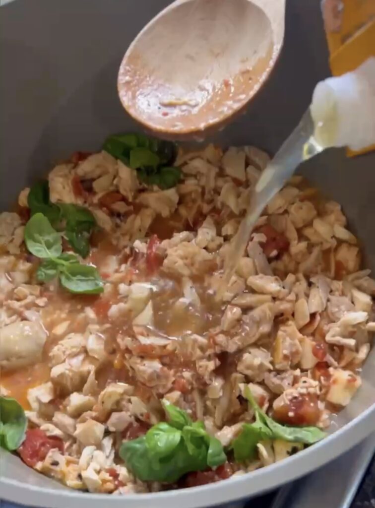 - add tomatoes, chopped rotisserie chicken, basil, tomato paste and combine well