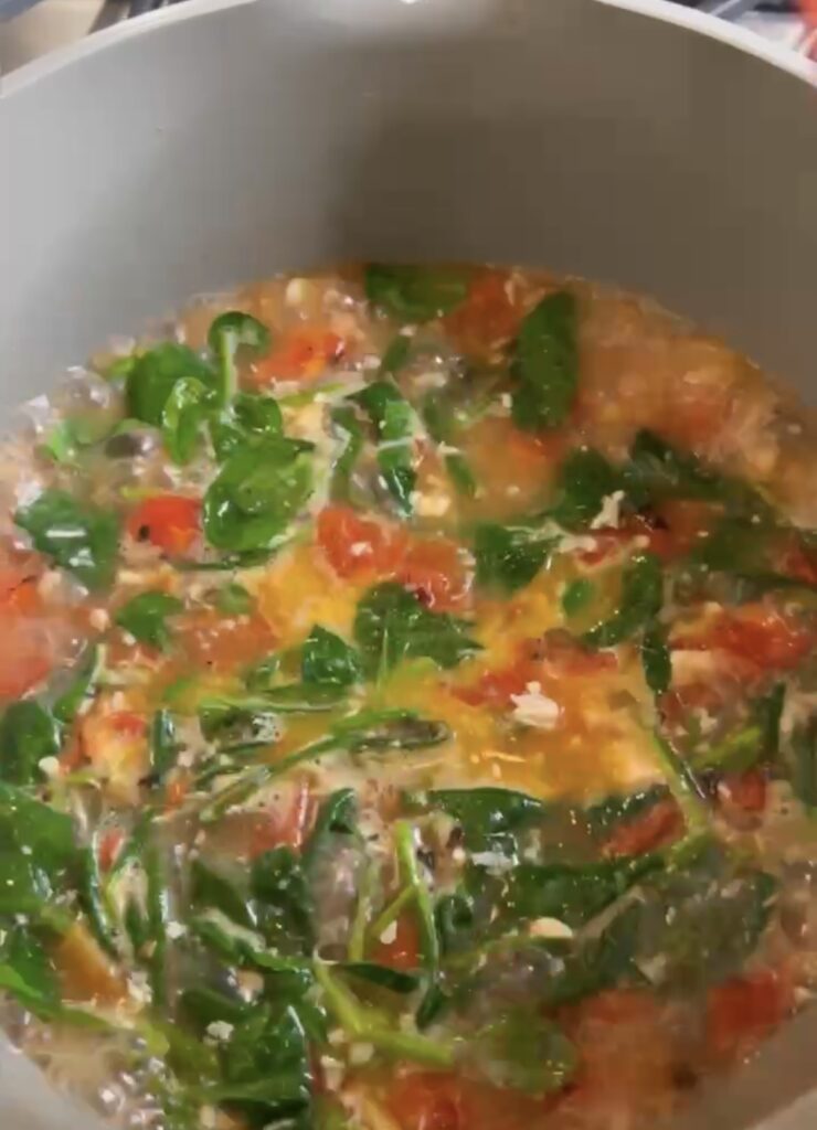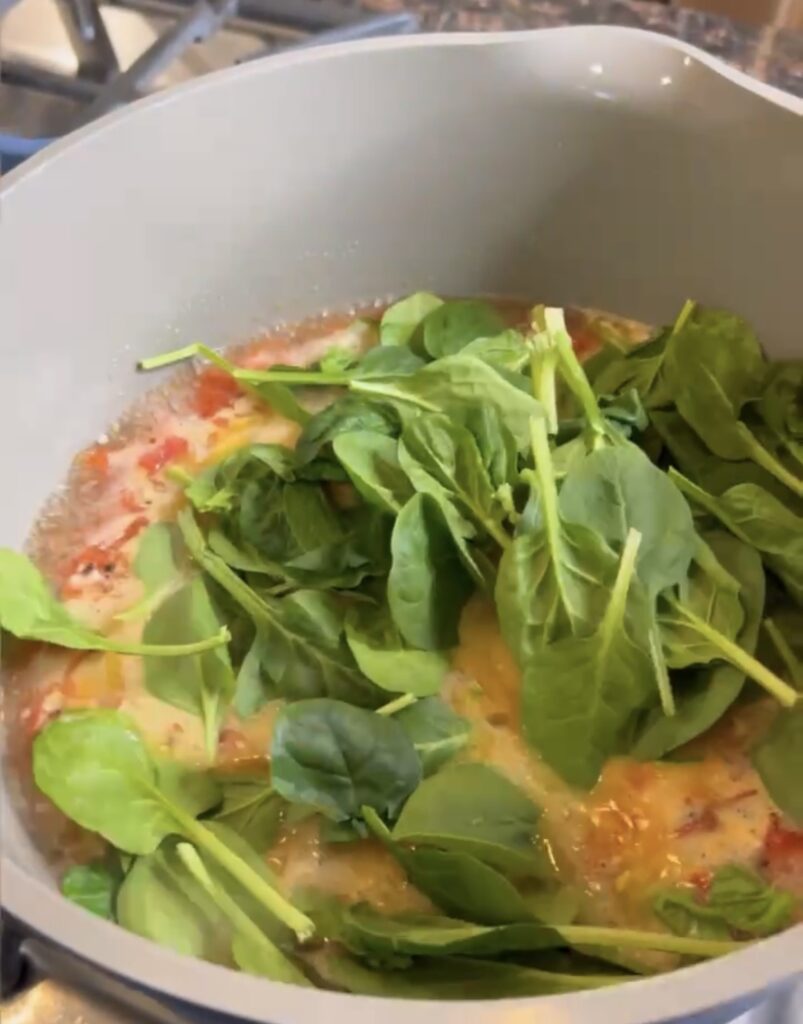 - then add chicken broth and fresh spinach. You don't have to tear this or remove steams unless you want to, because it will wilt down while cooking.