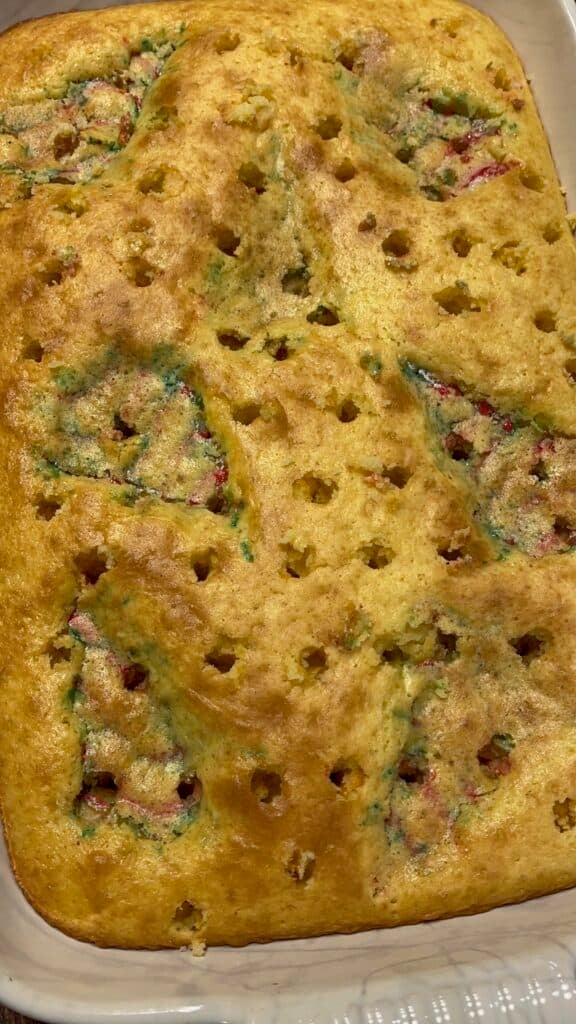 Poke holes all over the warm cake using the handle of a wooden spoon.