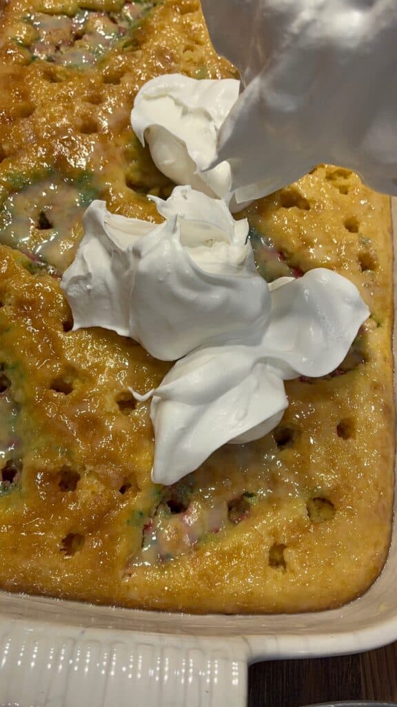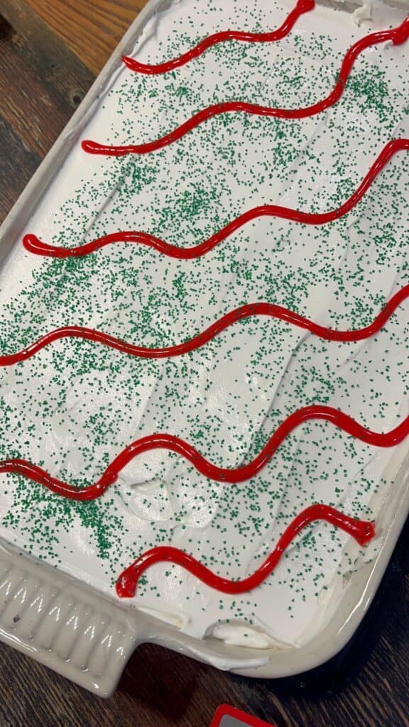 Want to take your Little Debbie Christmas Tree Poke Cake to the next level? Chop up two EXTRA Christmas Tree Cakes and sprinkle them on top of the Cool Whip before decorating. It adds texture, flavor, and makes the presentation extra festive — with zero extra effort, mama!