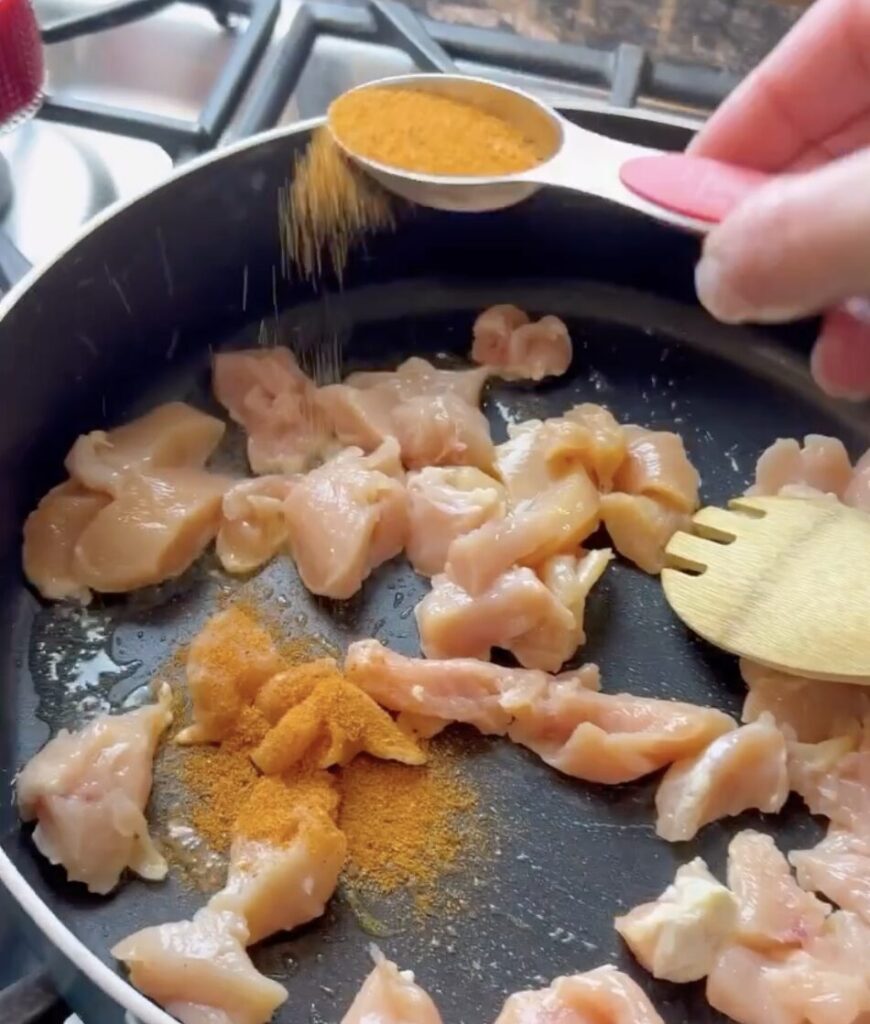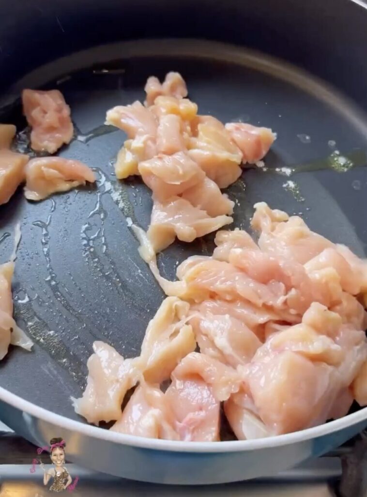 In a large skillet, Add olive oil, chicken and favorite cajun seasoning . Stir to mix & cook chicken