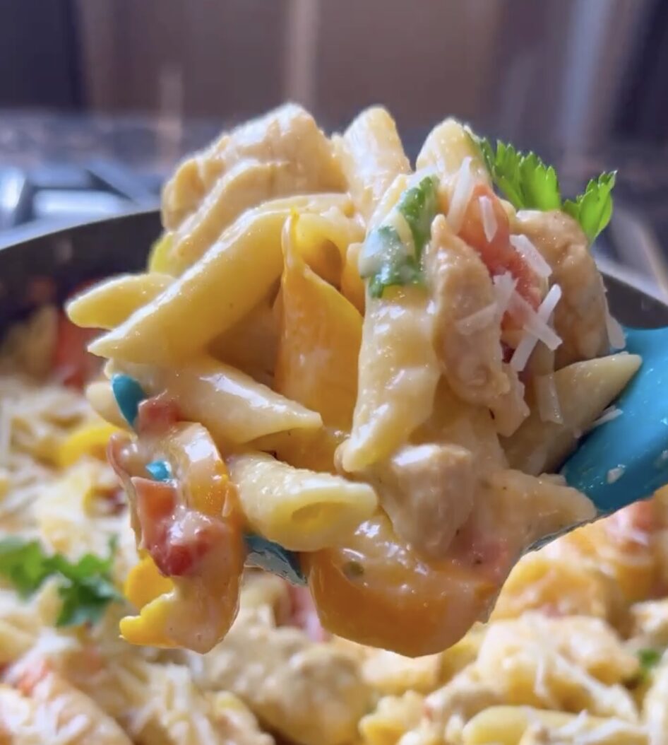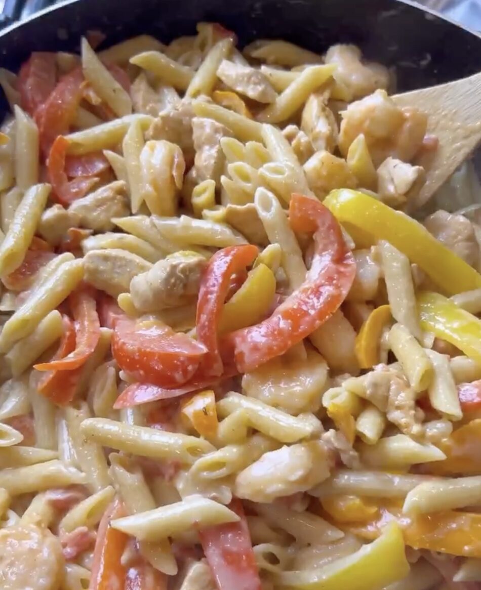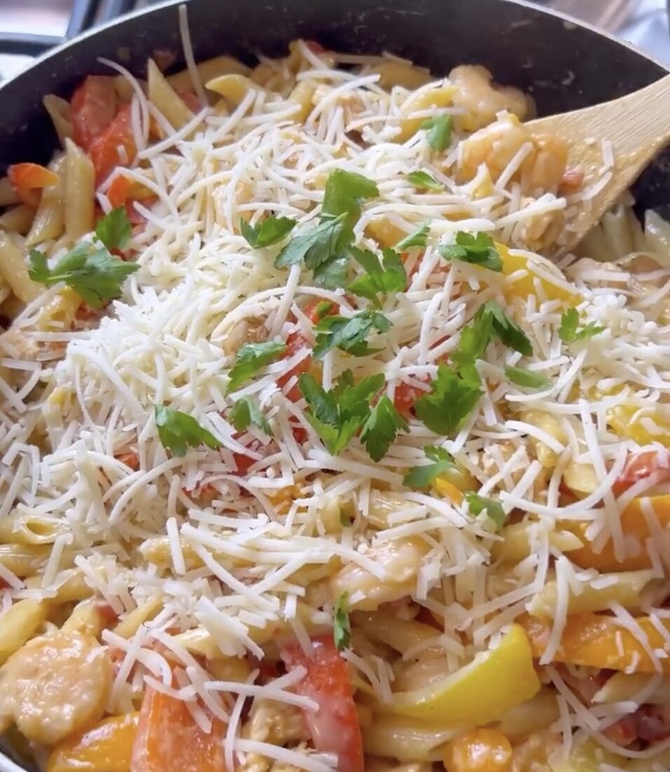 - Add the chicken and shrimp into the pasta mixture & stir.