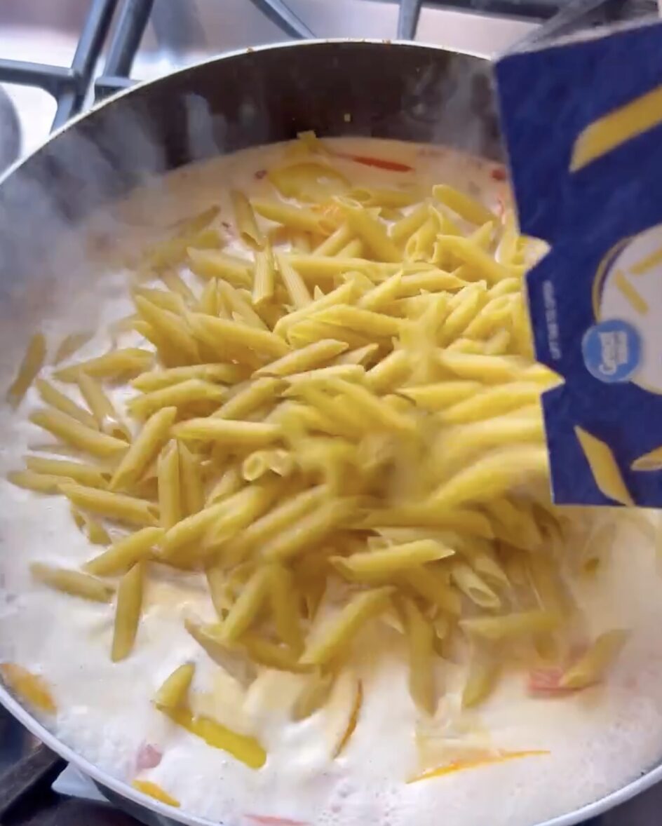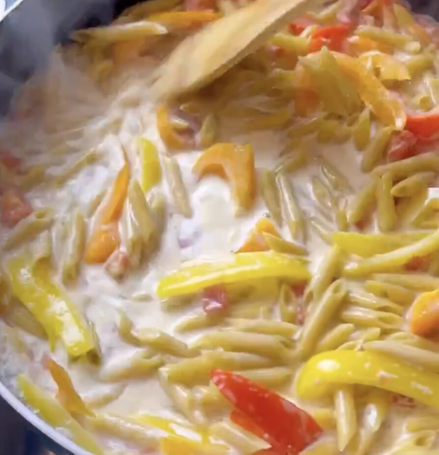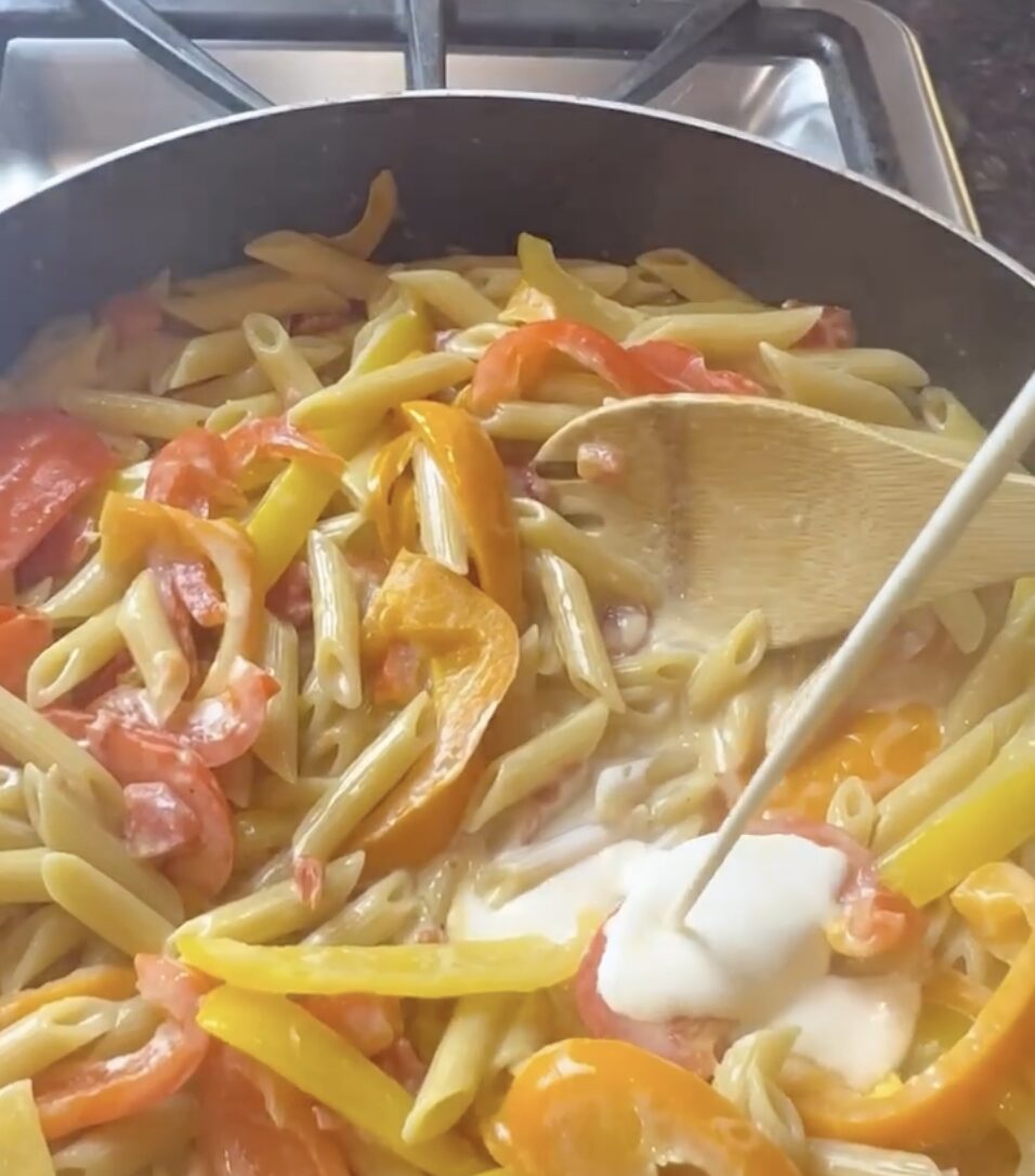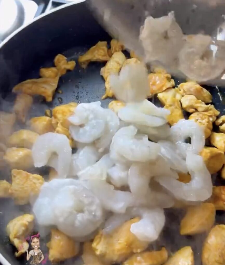 - Add the chicken and shrimp into the pasta mixture & stir.