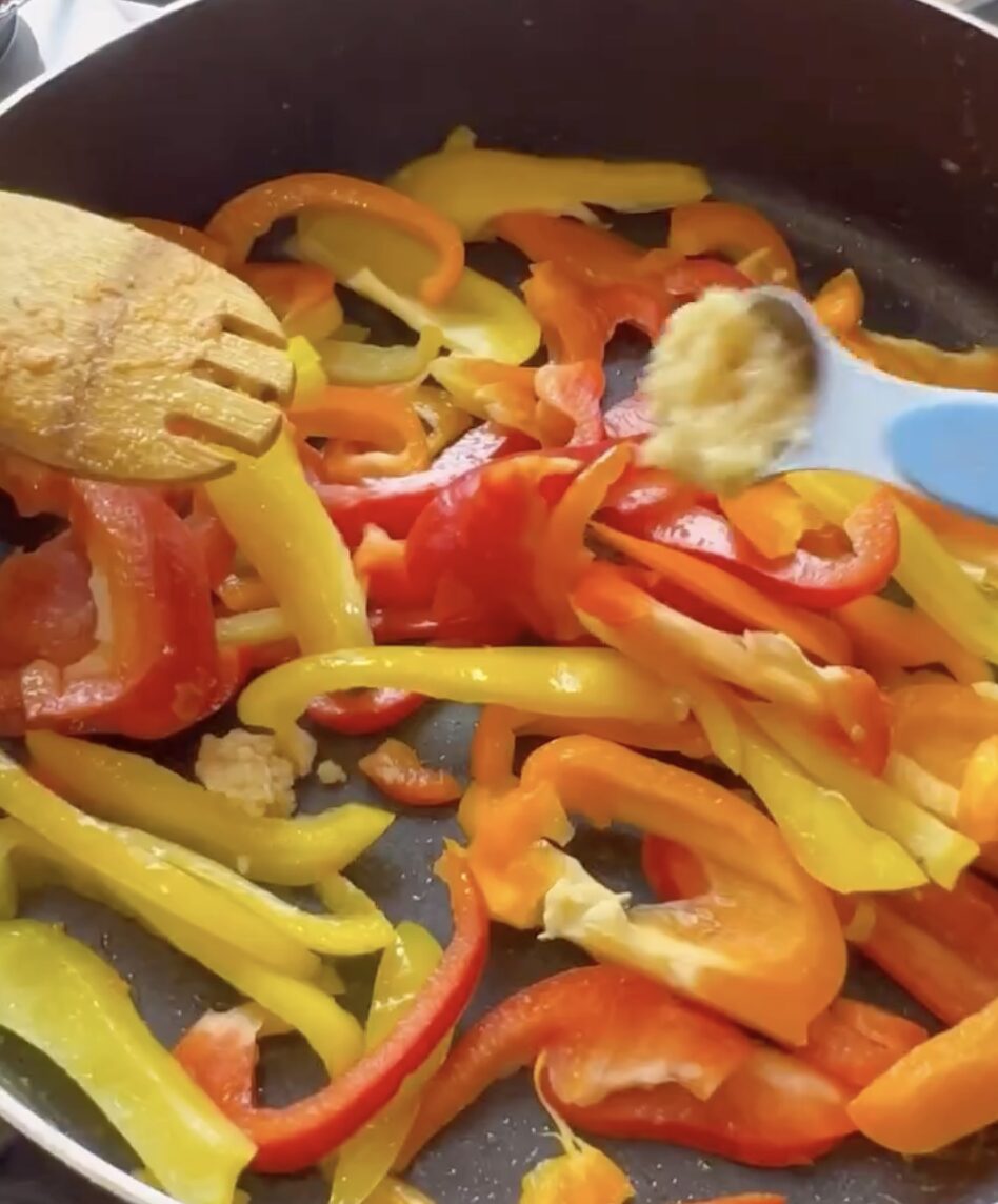 Add oil and peppers to the skillet then add rotel, garlic, and a shake of cajun seasoning & Sauté
