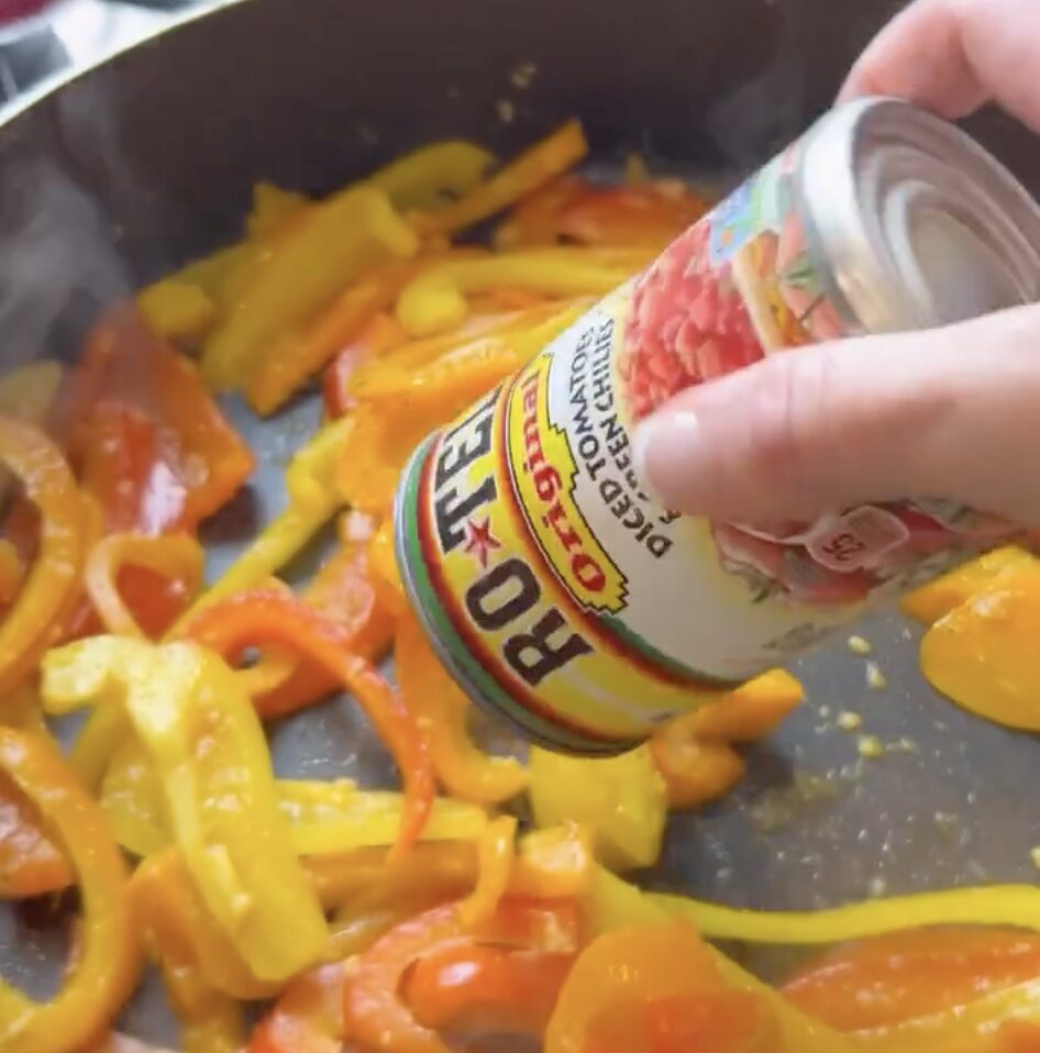 - Add oil and peppers to the skillet then add rotel, garlic, and a shake of cajun seasoning & Sauté