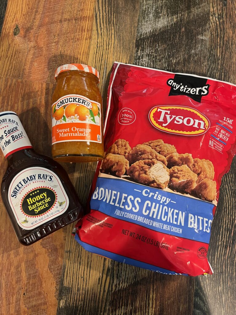 - While the chicken cooks, make the sauce: In a bowl, stir together the orange marmalade, BBQ sauce, and soy sauce.