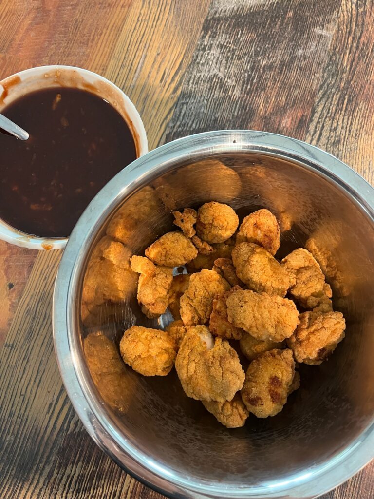 - Once the chicken is done, toss it in the sauce until fully coated and sticky.