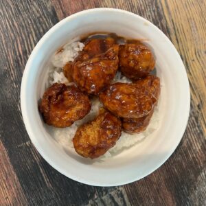 And the best part? It’s totally mom-hack approved. You’re starting with frozen popcorn chicken (hello, time-saver), whipping up a 3-ingredient sauce while it crisps in the air fryer, and serving it all over warm rice. That’s it. It’s ridiculously easy, and still feels like a win.