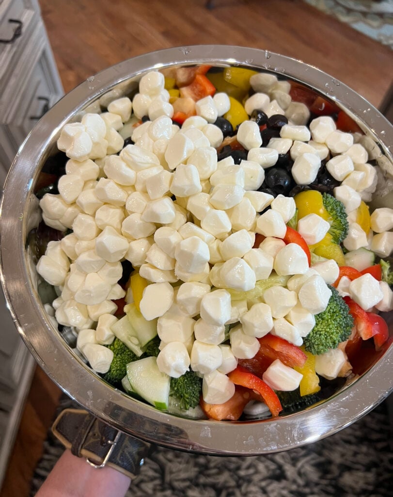 - Add mozzarella pearls – or any other cheese cubes you wish.