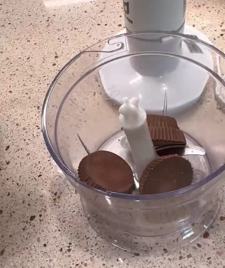 Take 4 1/2 Reese’s cups (reserving the other half for a garnish top of dip) and crush the cups in the immersion blender