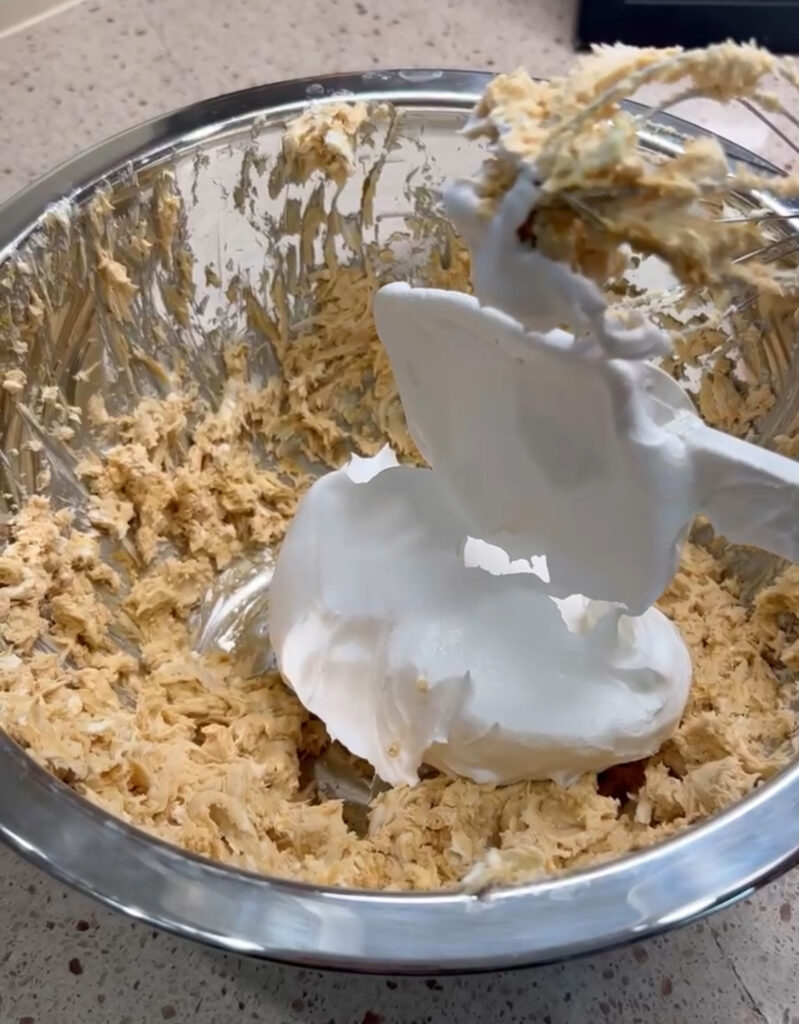 - In a large bowl place peanut butter, cream cheese, marshmallow creme and cool whip – mix them together with an immersion blender hand mixer