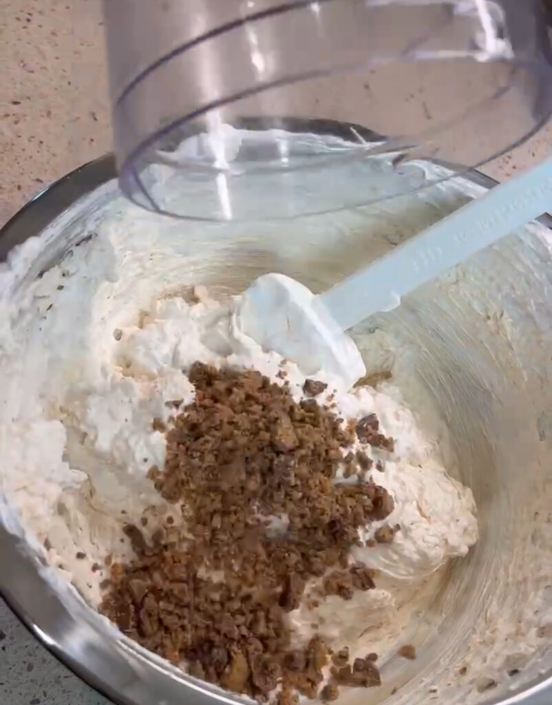 - Take crushed peanut butter cups and fold them into the cool whip mixture