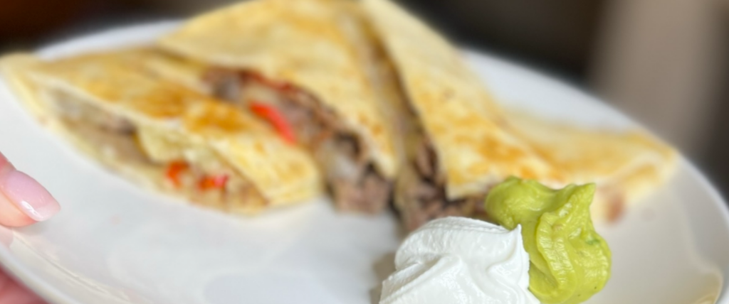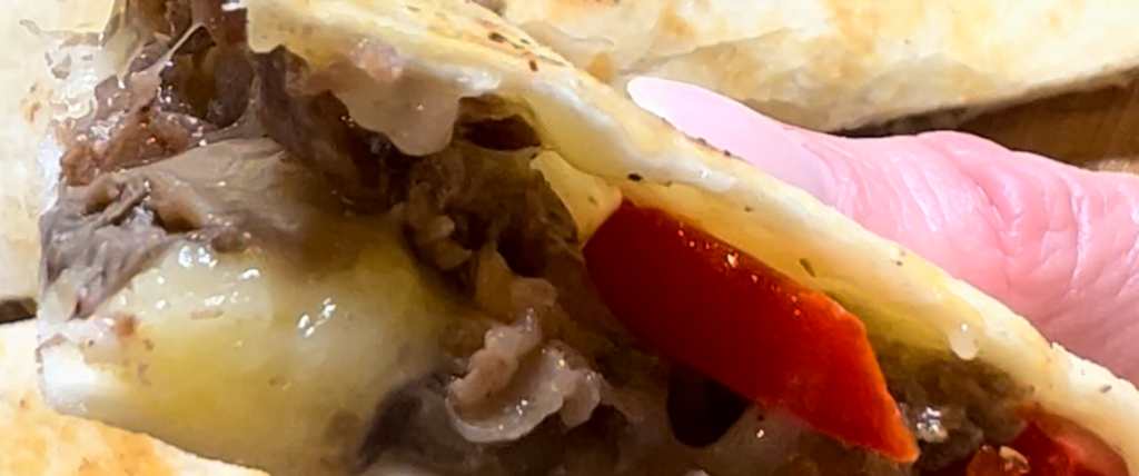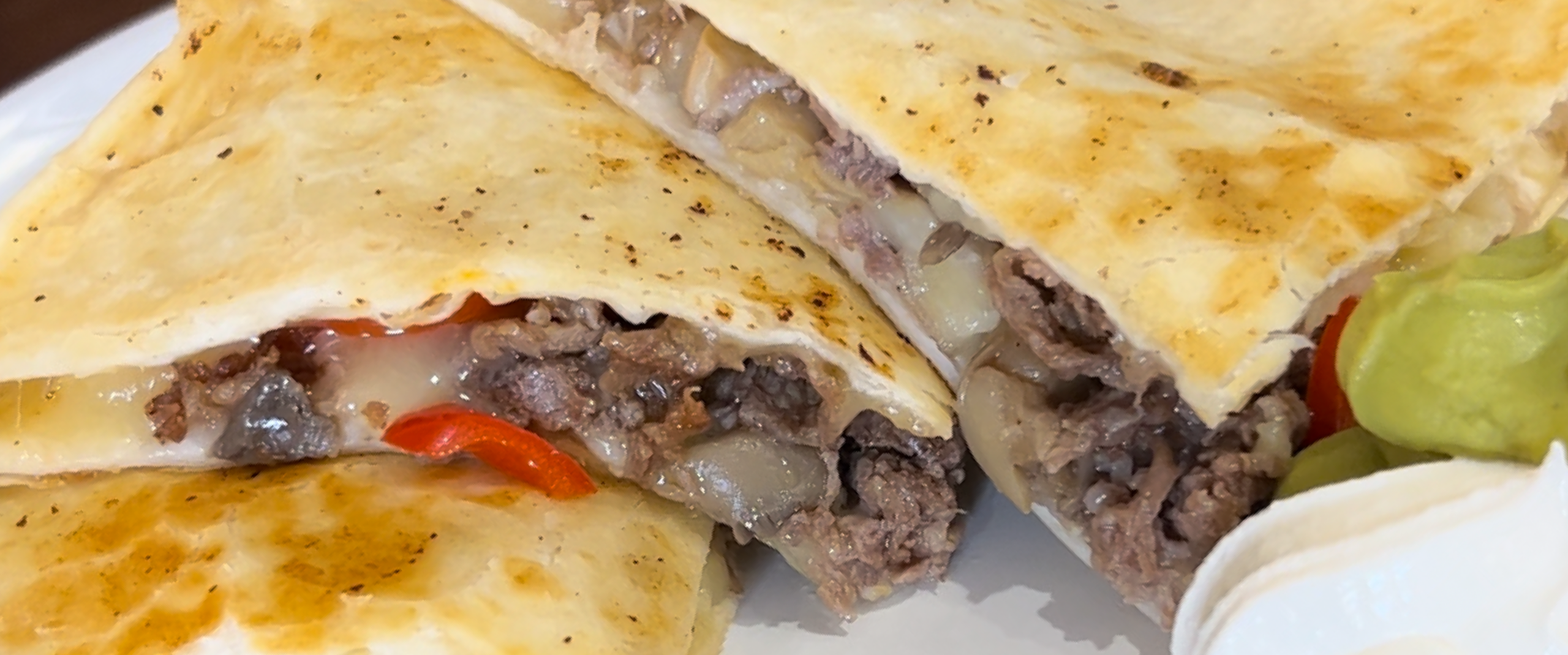 5- place bottom tortilla on cast iron with about a tbsp of butter and add steak & toppings with shredded cheese)