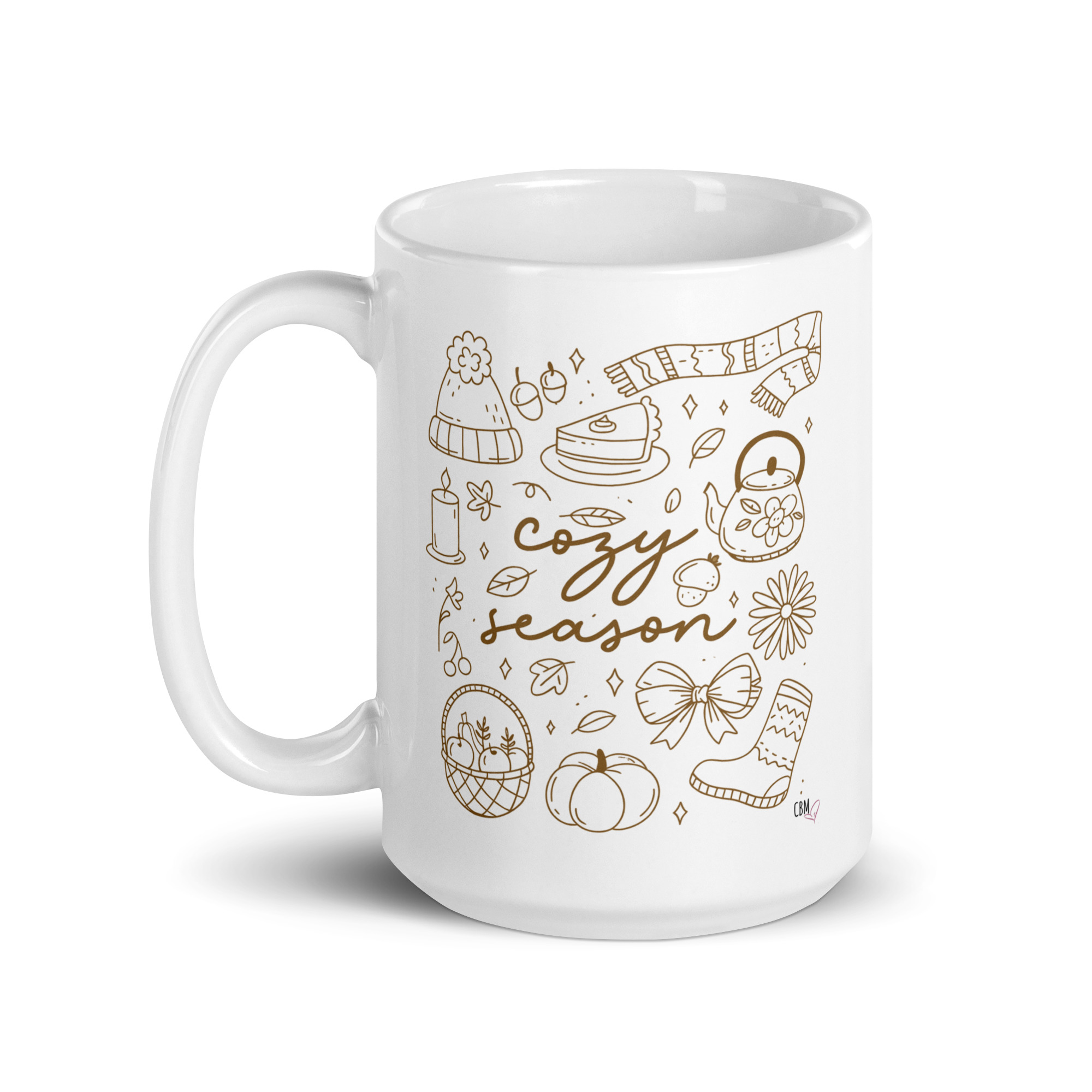 Wrap your hands around pure comfort with our Cozy Season Mug! Featuring an adorable hand-drawn design of fall favorites—like pumpkins, pie, a tea kettle, acorns, and warm winter accessories—this mug captures the magic of crisp autumn days and cozy nights in.