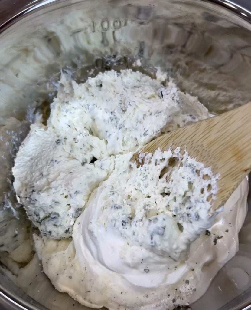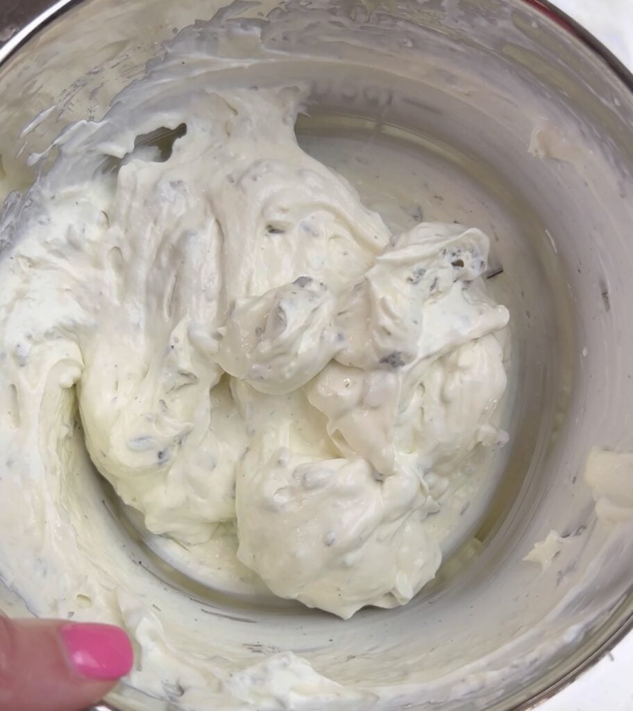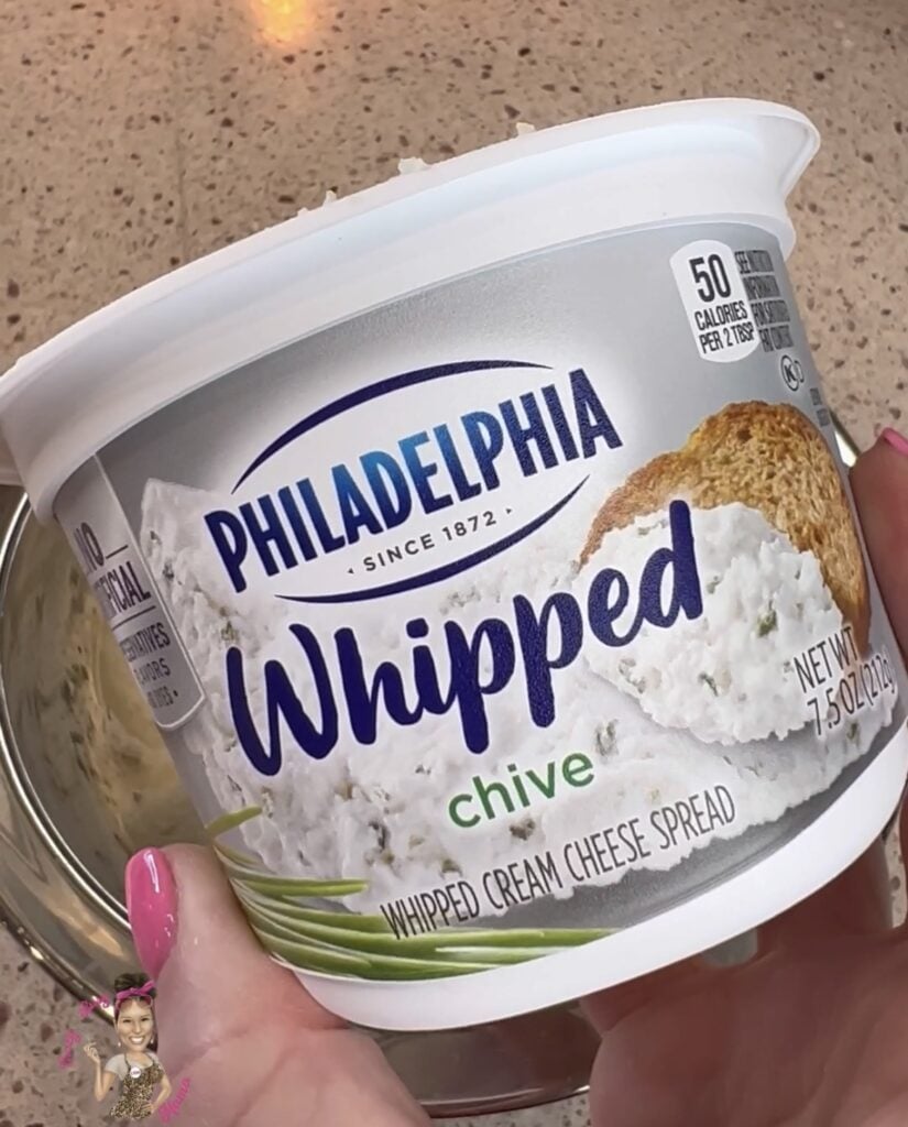 I am using whipped cream cheese making it a bit quicker so no need to let the cream cheese soften, plus this chive makes the best flavor in this dip. However, you can use plain cream cheese too- you will just need to let it soften before putting the dip together.