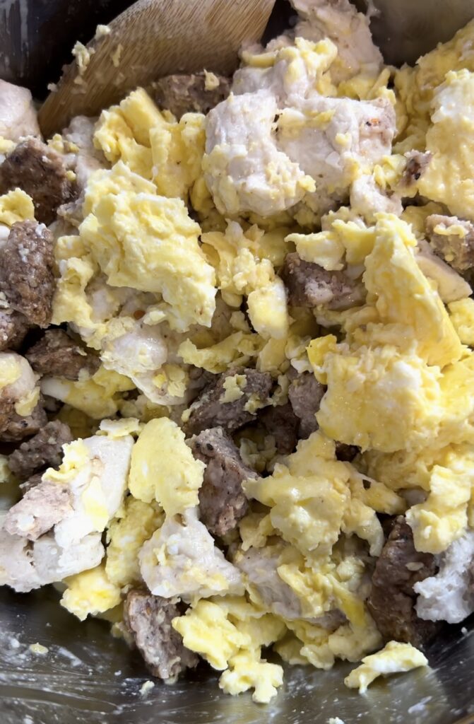 - In a large bowl add scrambled eggs, meat and the cut up biscuits and combine well