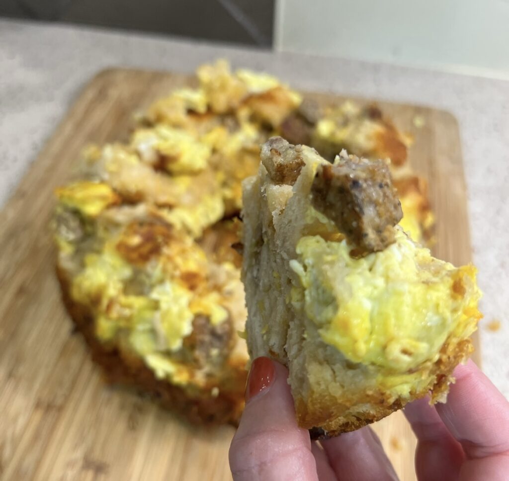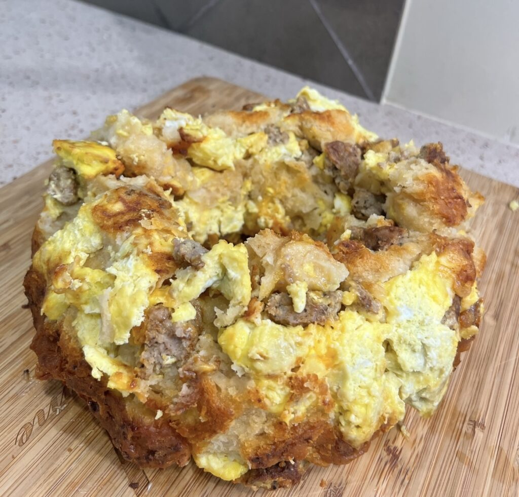 - Once eggs are scrambled add precooked sausage (you will want to cut these up) – you can also fry up sausage to use as well.