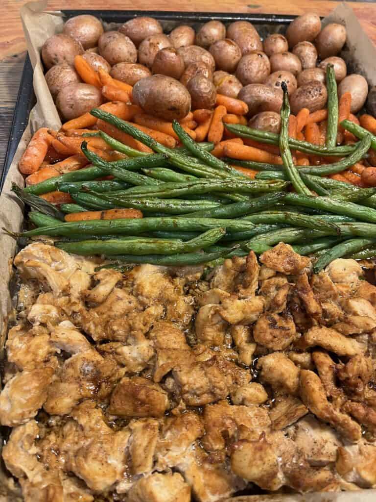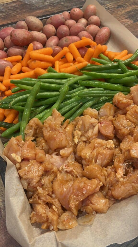 A simple one-pan dinner made with teriyaki-seasoned chicken, roasted potatoes, green beans, and carrots — finished with a drizzle of Japanese BBQ sauce.